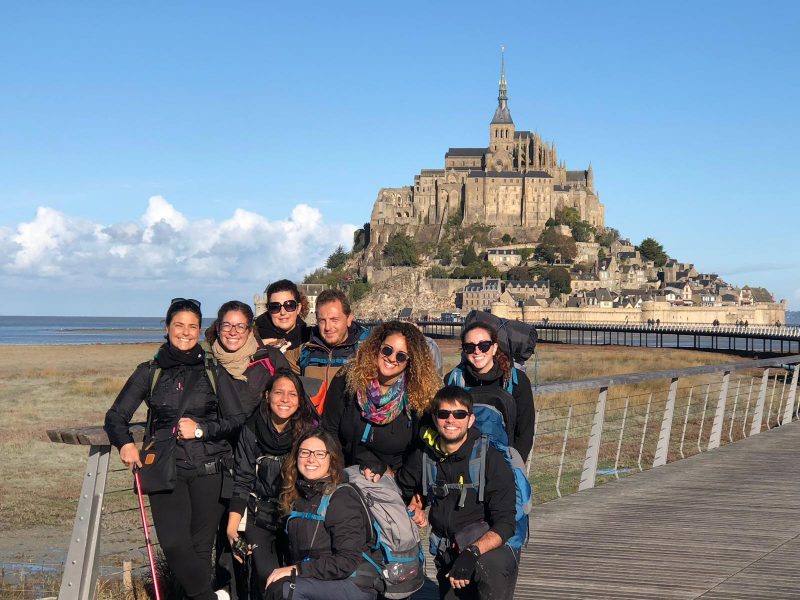 Ricalcola ad ogni passo e pensiero il tuo centro. S. Michele insegna la necessità di sentirsi in battaglia, il coraggio della spada. I monaci, l’arte antica del combattimento spirituale, come metodo per diventare creature unificate (“monos”, unico). “Giovanna d’Arco”, ha “visto la Francia” perché ha ascoltato una voce e con passione ha lottato fino alla fine contro e a favore di un presente che fa soffrire. Proseguiamo. Per definizione anche noi siamo pellegrini; camminiamo a lungo “per ager”, attraverso i campi. Finalmente caldi abbracci, una viva sensazione di casa e una cena pronta ci attendono in una “gîte” a Bas Courtils, consolando l’immagine di un “Minuetto” di battaglie perse, tradimenti fatti e subiti e l’incertezza che la stessa condizione di cecità comporta. Quando, come Bartimeo, non basta più nemmeno “elemosinare amore”, è allora che non hai più alternative e, accantonando ogni orgoglio e coerenza, ciò che resta è gridare. “Ho bisogno di Te” per vivere una vita da vivo, è la preghiera davanti a quel monte, non più cosi lontano, illuminato non solo da una magica luna piena. L’arrivo a Mont-Saint-Michel è un sorprendente gioco di squadra di mani tese tra sabbie scivolose e fiumiciattoli, sotto lo sguardo di buffi montoni. La gioia, lo stupore, il sole insolito; l’alta e la bassa marea si alternano veloci come il caos delle nostre emozioni. Salite faticose, corse a perdifiato e un po’ di incoscienza. Turismo e spiritualità, fede ed esoterismo. In vetta un panorama mozzafiato. Insieme a qualche sabbioso souvenir, custodiremo ad ogni passo del nostro presente così tanta bellezza? Come Bartimeo dopo la sua guarigione, riusciremo a scegliere di essere “quelli che restano” confermando il nostro sguardo? L’ispirazione è un attimo privilegiato, un momento di forte presenza a se stessi in cui, al contempo, qualcosa di “Altro” ti trova. Come la preghiera…Così è il cammino, il presente vissuto in pienezza che si estende luminoso e che ti si apre come dono.