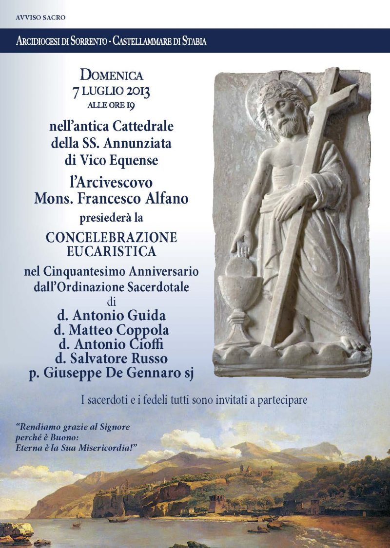 Domenica 7 luglio, nellantica cattedrale SS. Annunziata di Vico Equense, si festeggia il 50° anniversario di ordinazione sacerdotale di don Antonio Guida, don Matteo Coppola, don Antonio Cioffi, don Salvatore Russo (tutti sacerdoti della nostra arcidiocesi) e di padre Giuseppe De Gennaro, gesuita originario delle nostre terre.