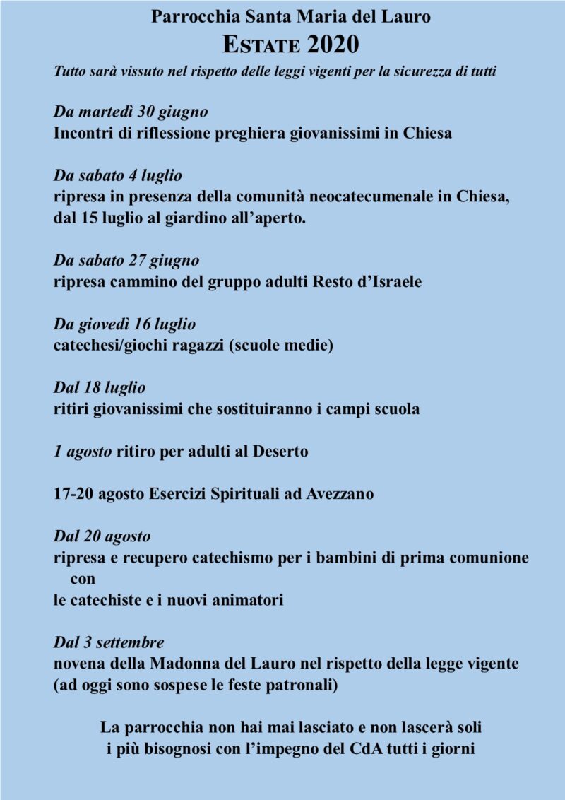 Dopo aver vissuto il consiglio pastorale parrocchiale, seppur nel contesto di precarietà che caratterizza in questo tempo ogni programmazione pastorale, abbiamo provato a riprendere le attività estive nella consapevolezza di dover essere prudenti e di vivere nella gradualità la ripresa delle attività pastorali, impegnandoci tutti a rispettare scrupolosamente le leggi vigenti per la sicurezza di tutti. In questa prima parte dell’estate ci stiamo dedicando agli adolescenti, età sempre così delicata e bisognosa di cura. Li abbiamo prima incontrati in chiesa per un momento di preghiera e in queste settimane poi stiamo vivendo con loro ritiri di due giorni a piccoli gruppi che in qualche modo sostituiranno i campi scuola.