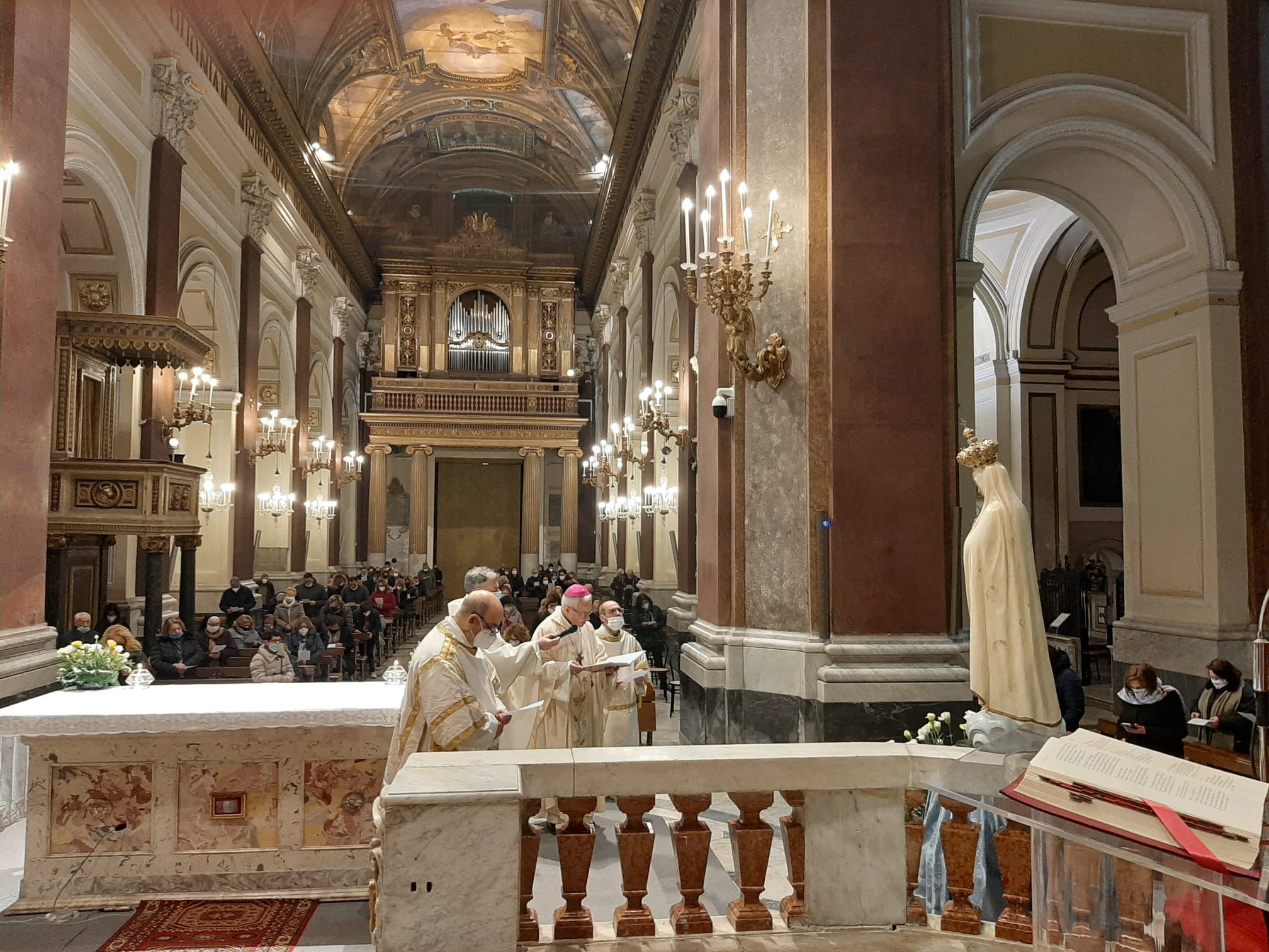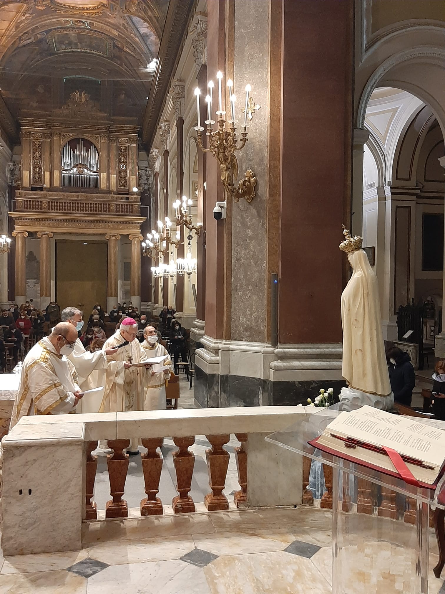 E poi l’angelo pronuncia quella parola che attraversa tutta la storia della salvezza, da Abramo a Maria e Giuseppe, “Non temere” non avere paura, la paura ti blocca, non ti liberi della paura e ancora Maria reagisce, accoglie facendo domande, il disegno di Dio è così grande che non può comprenderlo se non facendosi aiutare. “Come sarà possibile?” Maria, prima si è lasciata interrogare interiormente dalle domande suscitate dalla parola, poi pone lei stessa le domande lei che non è sposata, che osserva la legge di Mosè severissima in questi casi, come spiegarlo a Giuseppe? e nonostante tutto non si scoraggia. Pronunciare un Atto di consacrazione non è dire “ci pensi tu” ma vuol dire “ ci impegniamo ad essere come te” e questa sera lo diciamo con tutto il popolo di Dio sparso su tutta la Terra e non solo questa sera, ma sempre. Poniamo domande e lo Spirito sarà l’unico a darci risposte veritiere, che non avremo mai andando dietro all’effimero che ci può solo confondere. Dinanzi a questo dono dello Spirito Maria non solo si apre, ma le viene data anche la strada e l’ha seguita, fino alla croce perché potesse essere per noi un segno di speranza, di consolazione. Andiamo incontro agli altri per servire, per amare, per condividere la speranza, per lottare contro il male, per costruire fraternità, per instaurare la pace che non verrà all’improvviso, ma nascerà dalla conversione dei cuori. Infine diciamo con Maria, amata da tutto il popolo di Dio, “ECCOMI SIGNORE, LA TUA PAROLA SI COMPIA ANCHE IN ME PER IL BENE DELL’UMANITA’”.
