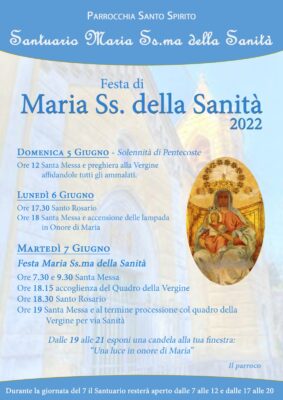 Il programma religioso prenderà il via, domenica 5 giugno, quando si affideranno alla Vergine tutti gli ammalati durante la S.Messa delle 12.00. Lunedì 6 Giugno durante la S.Messa delle 18.00, sarà accesa una lampada dinanzi alla Madonna per affidarle la comunità parrocchiale di Santo Spirito a Quisisana e di San Matteo. Infine martedì 7 giugno, giorno della Festa, saranno celebrate le S.Messe alle 7.30 e alle 9.30 durante la quale giungeranno al Santuario in pellegrinaggio fedeli della parrocchia Ss.mo Salvatore di Scanzano, insieme al loro parroco don Vincenzo Esposito e poi a sera alle 18.15 il santuario accoglierà il quadro della Madonna della Sanità, portato dalla Famiglia Starace. Il programma religioso terminerà con la santa messa delle 19:00 e una breve processione.