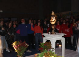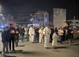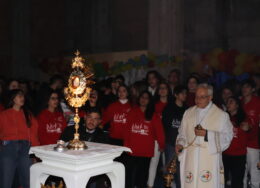 Dagli spazi all’aperto, che in pochi minuti il calore dei tanti hanno reso più caldi ed accioglienti, ci siamo incamminati in preghiera verso la parrocchia. Ancora silenzio, ciascuno assorto nei propri pensieri. E ancora musica, perchè chi canta prega due volte. Ad accompagnarci in una lunga riflessione Mons. Franceco Alfano: “Il desiderio che portano i giovani di vivere e stare davanti a te Gesù, è meraviglioso. Qui le differenze di età si accorciano, diventiamo quasi una sola voce. Non siamo una massa, ognuno di noi, davanti a te, ritrova te stesso, siamo qui, con quello che appare e quello che è nascosto. Siamo insieme, con le mani che si stringono e con il corpo che danza. Alle volte ci portiamo dolori grandi dentro eppure davanti a te stiamo bene, non è forse questo un piccolo miracolo?”.