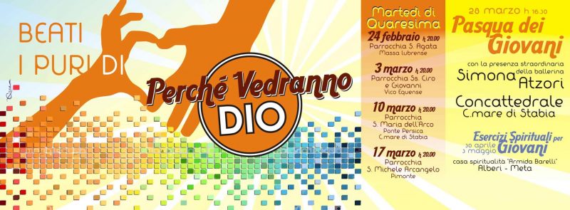 I Martedì di Quaresima si terranno il 24 febbraio, alle ore 20, nella parrocchia di Sant’Agata, a Massa Lubrense, il 3 marzo, alle ore 20, nella parrocchia di SS. Ciro e Giovanni Vico Equense, il 10 marzo, alle ore 20, nella parrocchia di Santa Maria dell’Arco Ponte Persica a Castellammare di Stabia, il 17 marzo, alle ore 20, nella parrocchia di San Michele Arcangelo, a Pimonte.