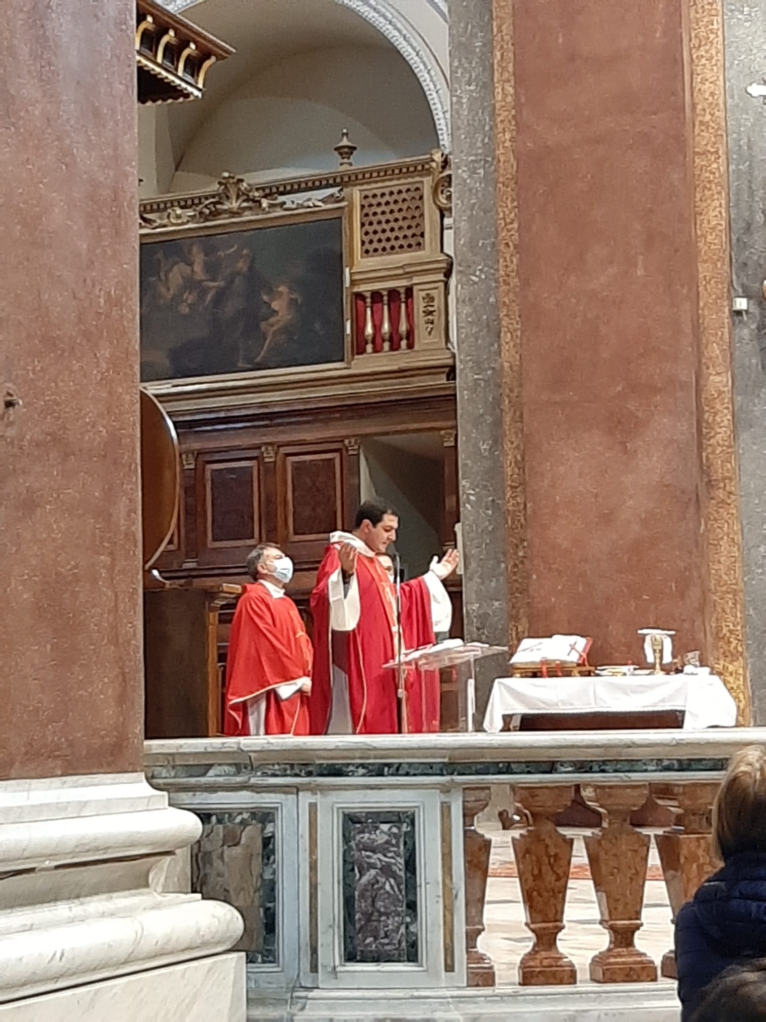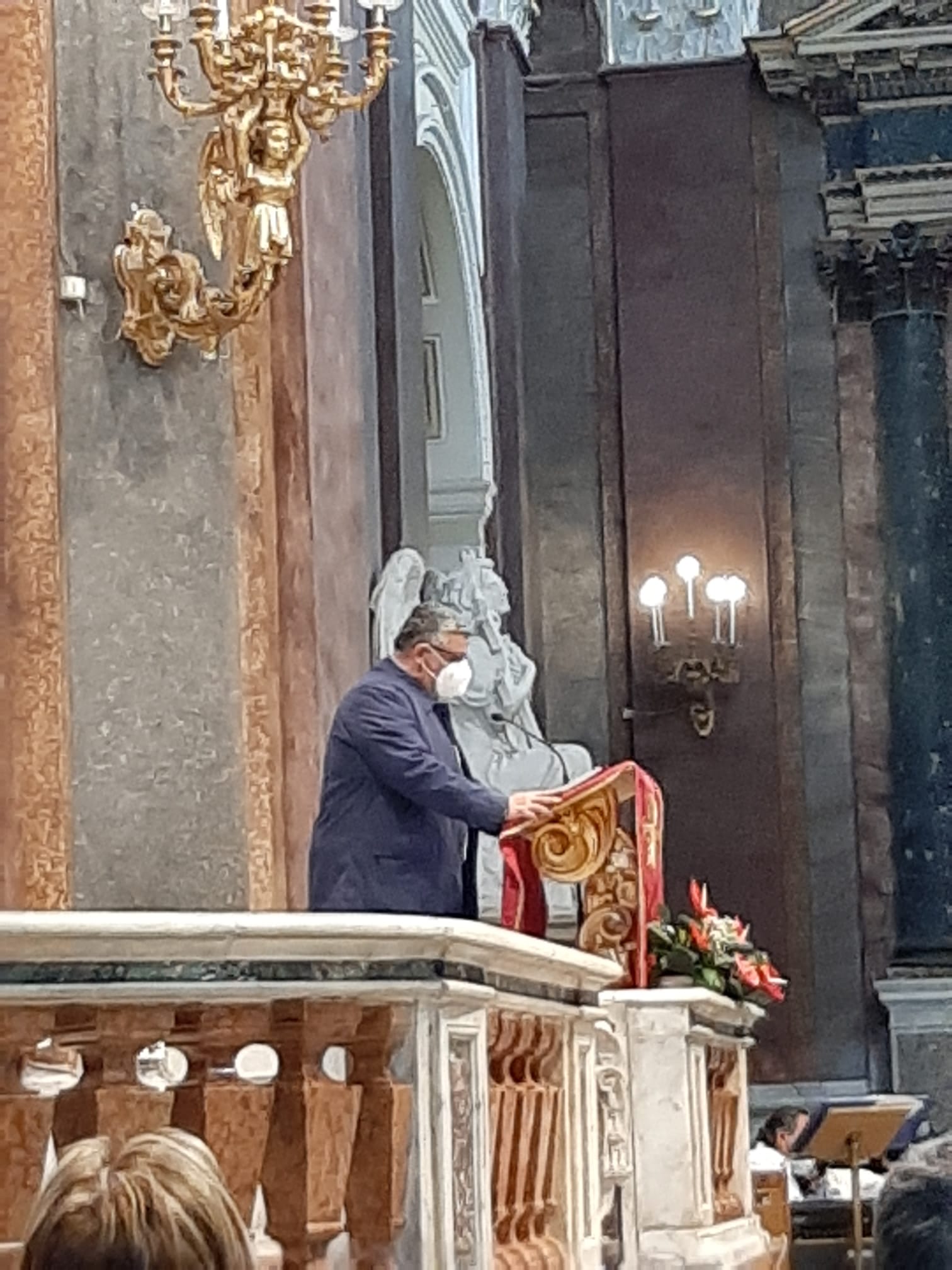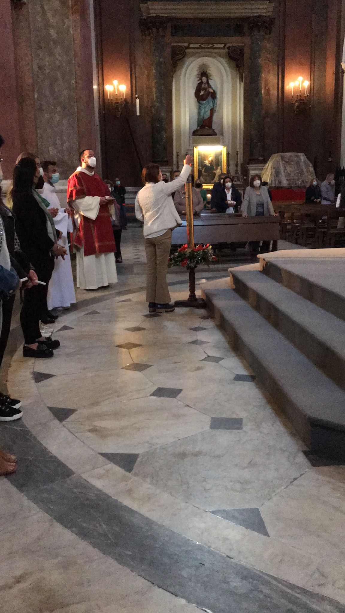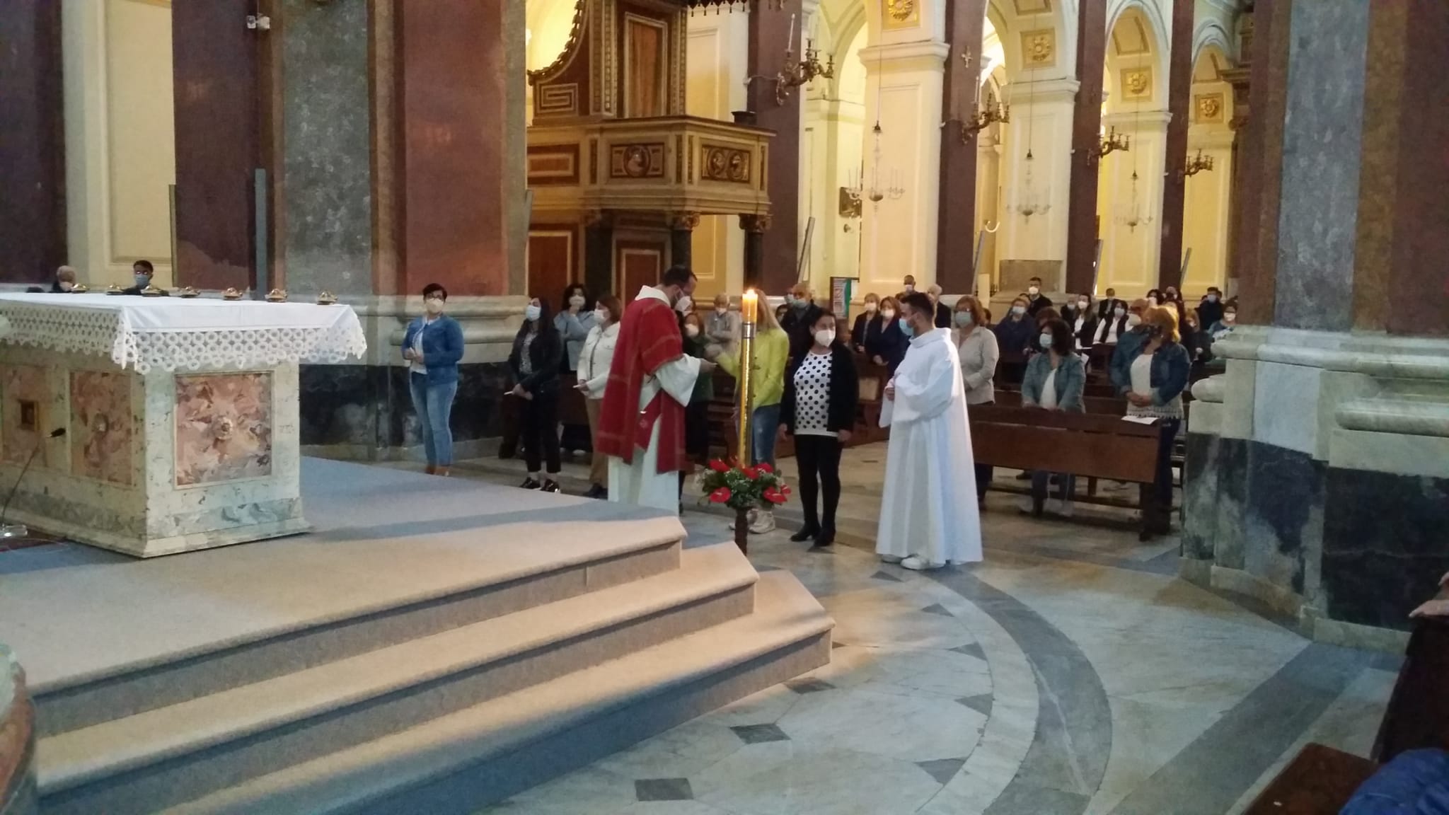 “Dobbiamo distinguere la nostra “sete” dobbiamo ricevere la medicina che guarisce i nostri mali !E qual è il Virus che ci fa piu’ male? E dal quale dobbiamo difenderci? Il virus più pericoloso per un cristiano è quello dell’egoismo e della solitudine che rappresentano tutto l’opposto di ciò che stiamo vivendo stasera, sono due facce della stessa medaglia perché insieme corrodono la nostra vita perché c’inducono a pensare di poter fare a meno degli altri ,corrodendo la nostra anima. Allora come superare questo pericolo? Quale vaccino prendere per curarci e salvarci? La cura è lo Spirito Santo che è già dentro di noi ,Egli è la prima dose che già ci nutre e ci cura da dentro. E come prendere questo vaccino??Certamente non da soli , si prende necessariamente insieme agli altri vivendo uniti nella Comunità, infatti non c’è Spirito Santo se non c’è Comunità, perché la mia vita non è soltanto la mia ma vive e si nutre solo insieme ai fratelli, proprio come pronunciato da Papa Francesco: ”Nessuno si salva da solo”. Come tutti i vaccini anche quello dello Spirito Santo ha bisogno del richiamo e il suo è l’Eucarestia .In ognuno di noi abita dunque lo Spirito Santo ma a volte guardiamo all’altro come un pericolo ,un nemico che puo’ contagiarci e allora agiamo con disprezzo e superiorità mettendoli da parte. Per non farci contagiare da questo virus dobbiamo guardare all’altro come Tempio dello Spirito Santo proprio come ci guarda il Signore e insieme volgere il nostro sguardo al cielo così come fecero la Madonna e gli Apostoli nel giorno di Pentecoste che attendevano qualcosa di bello ,di grande , perché ciascuno di loro aveva riconosciuto nell’altro il Tempio dello Spirito Santo e insieme avevano invocato la Sua discesa non per tenerselo dentro ma per portarlo agli altri che erano fuori ,nel mondo e viverLo nella pienezza .”