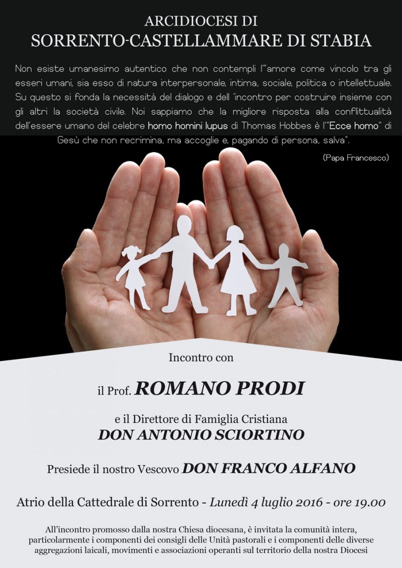 Questa sera alle ore 19:00 presso l’atrio della Cattedrale di Sorrento vivremo l’incontro promosso dalla nostra Chiesa diocesana, con il Prof. Romano Prodi e il Direttore di Famiglia Cristiana don Antonio Sciortino, presiede il nostro Vescovo Mons. Francesco Alfano.