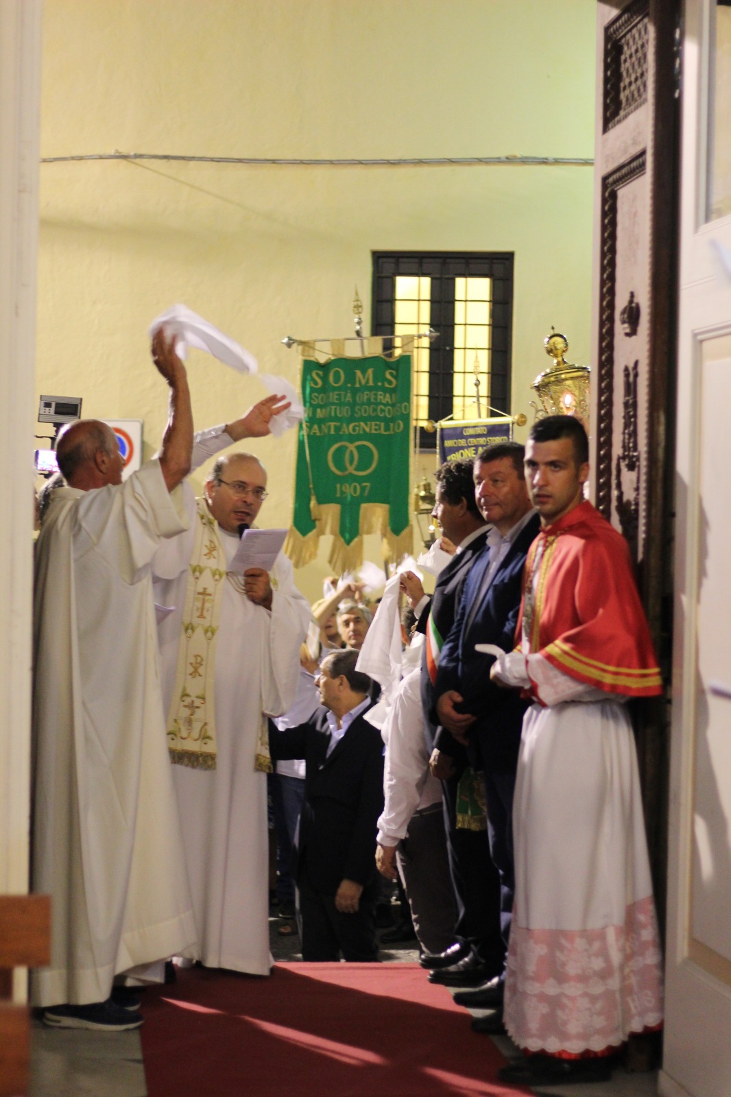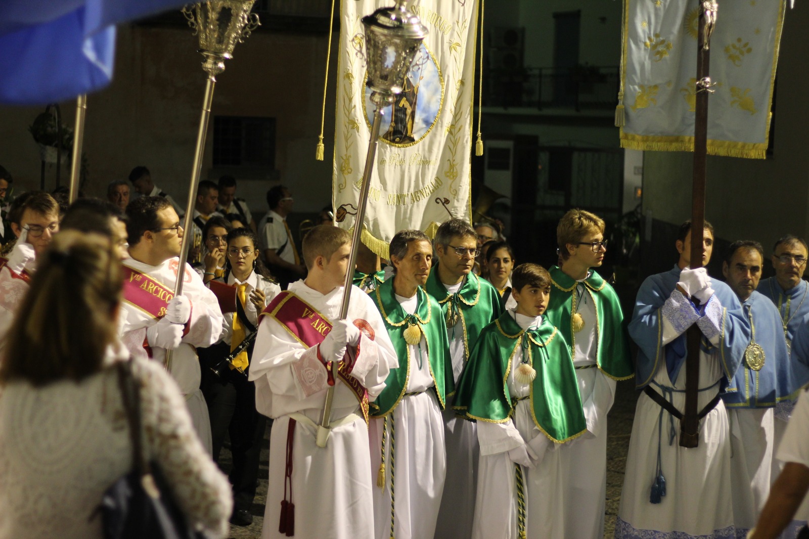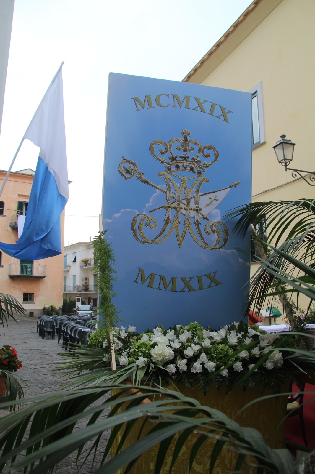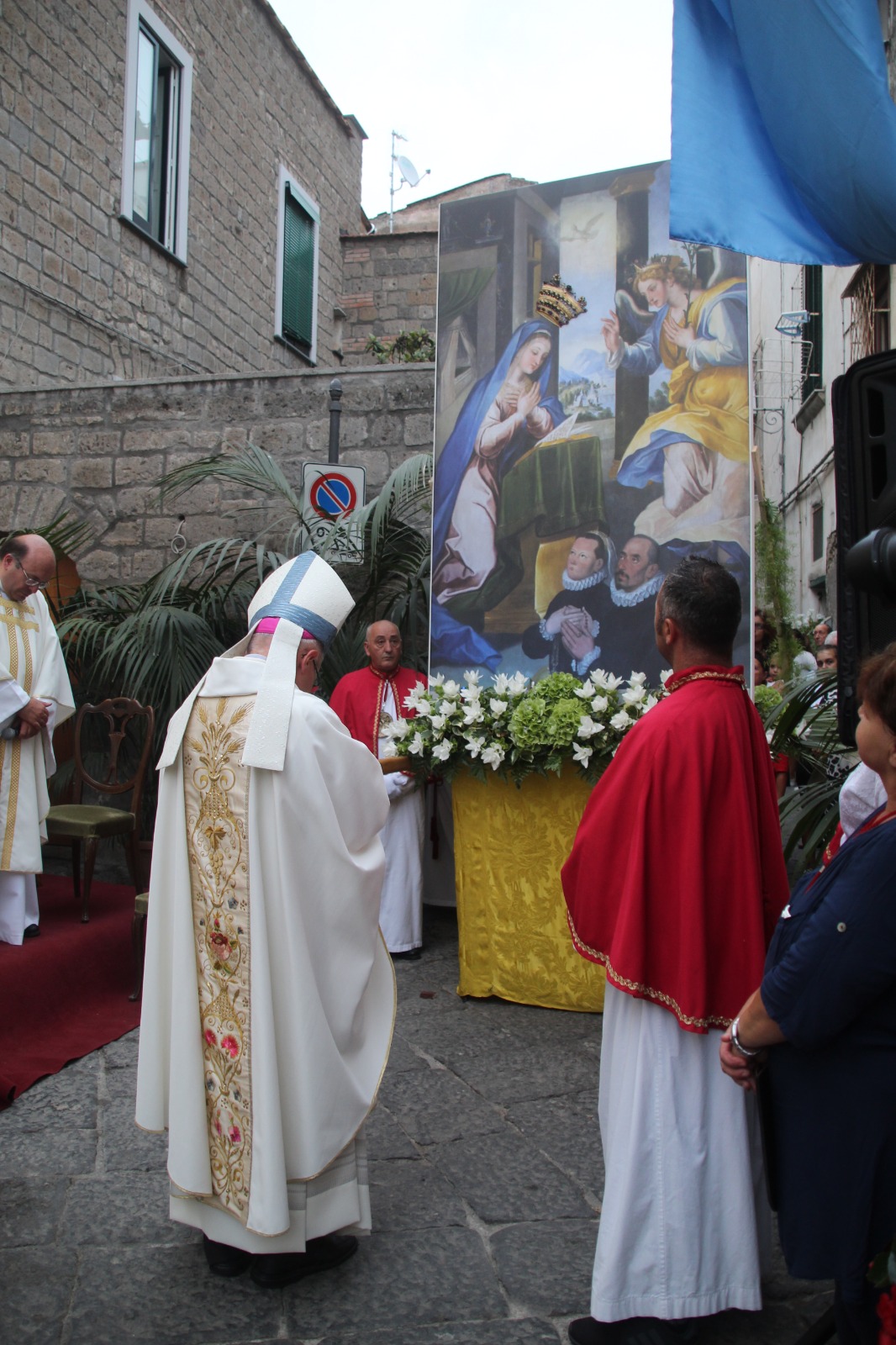 Dopo il rito religioso l’effige incoronata è stata portata in processione per le strade del paese. Al rientro dei pellegrini, davanti al Santuario, sulle note della canzone “Evviva Maria”, cantata dalla Corale dei Santi Prisco e Agnello e dai fedeli tutti, lo sventolare di fazzoletti bianchi ha salutato lo svelamento della pala d’altare, abbellita da un diadema d’oro.