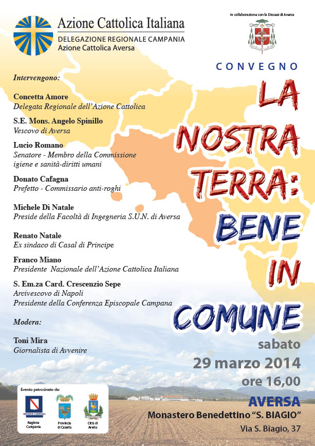 Sabato 29 marzo ci sarà ad Aversa un momento di riflessione su un tema caro all’Azione cattolica: il bene comune. “La nostra terra: bene in comune” il titolo del convegno, che vedrà la partecipazione di Concetta Amore, delegata regionale dell’Azione cattolica, monsignor Angelo Spinillo, vescovo di Aversa, Lucio Romano, senatore membro della Commissione igiene e sanità-diritti umani, Donato Cafagna, prefetto commissario anti-roghi, Michele Di Natale, preside della facoltà di Ingegneria S.U.N. di Aversa, Renato Natale, ex sindaco di Casal di Principe, Franco Miano, presidente nazionale dell’Azione cattolica italiana, il cardinal Crescenzio Sepe, arcivescovo di Napoli, presidente della Conferenza episcopale campana. Modererà Toni Mira, giornalista di Avvenire. Quest’anno si è scelto di riflettere e mettere in circolo esperienze, conoscenze, energie e risorse in relazione al tema della nostra terra come bene in comune. Il riferimento alla Terra dei fuochi è stato d’obbligo per l’Ac regionale e il taglio del convegno è quello della speranza e della riflessione popolare e democratica che spinge all’impegno. Domenica 30, invece, sarà celebrato il consiglio regionale, composto da tutte le presidenze diocesane di Azione cattolica delle diocesi della Campania. Anche qui sarà discusso un breve documento regionale, che riprende, in chiave locale, la bozza di documento nazionale, e saranno eletti i membri della delegazione regionale, che costituisce un coordinamento tra associazioni diocesane. Nel clima di festa che sempre caratterizza questi incontri le associazioni diocesane presenteranno le loro esperienze più significative e si confronteranno con le sfide ecclesiali e civili del territorio regionale.