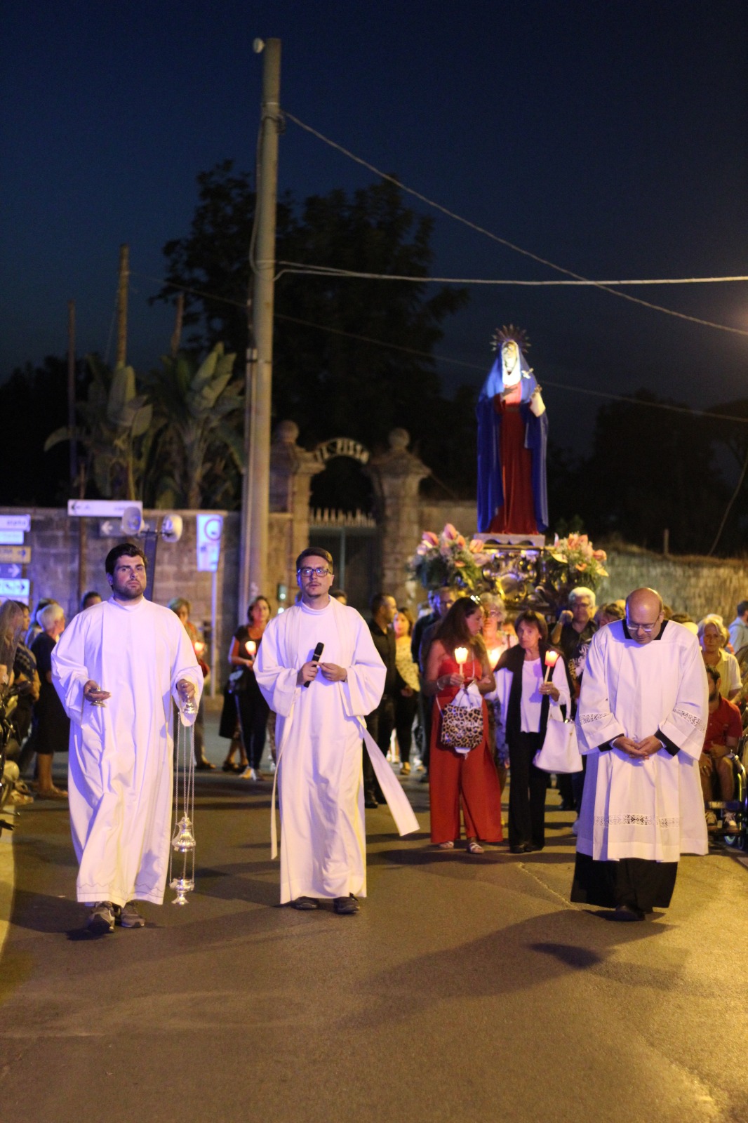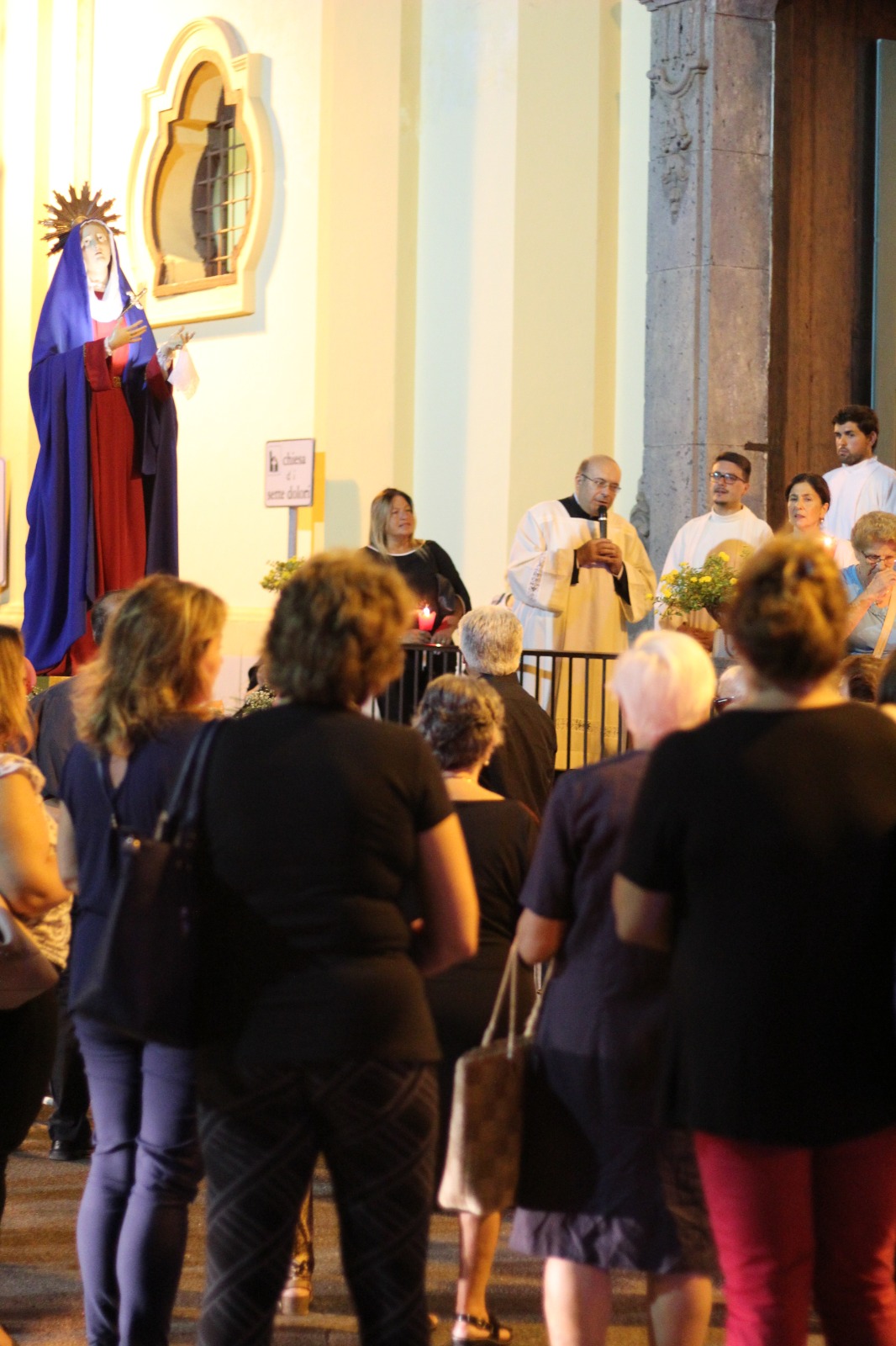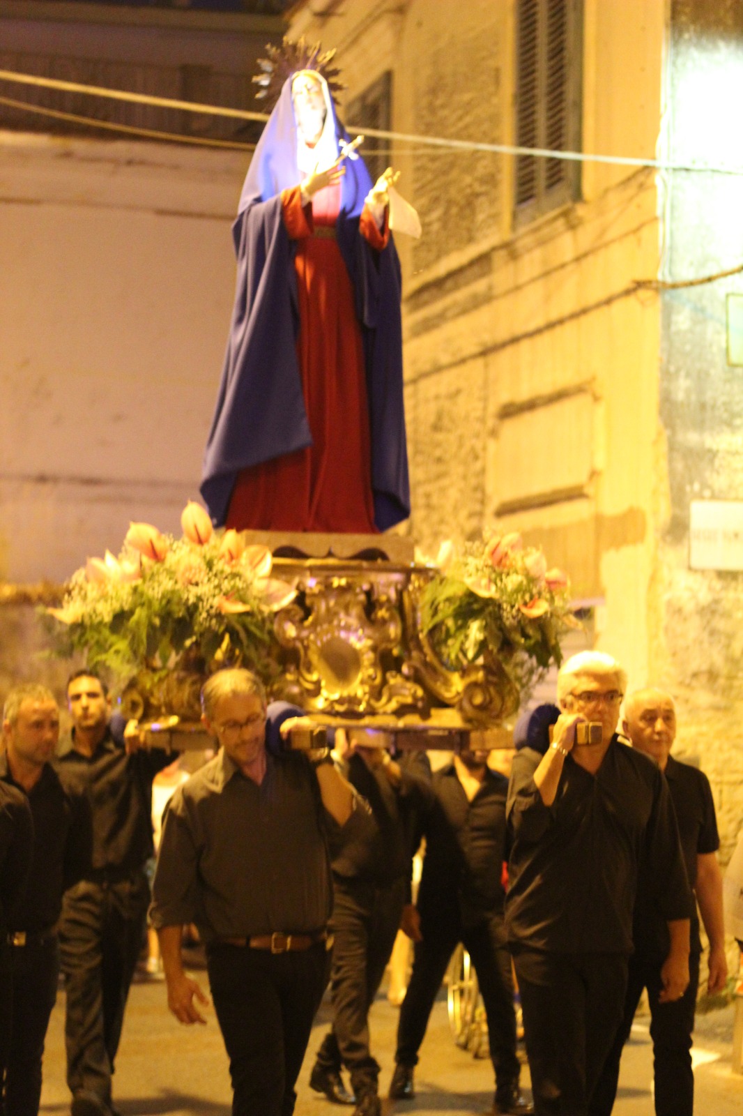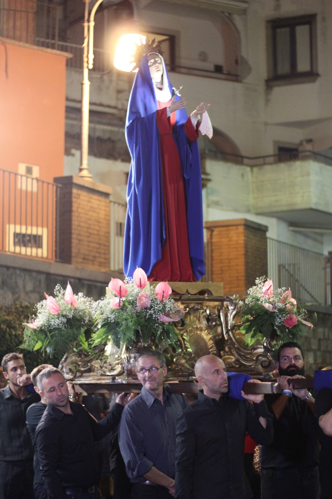 Sabato 14, al termine della Celebrazione Eucaristica presieduta dal viceparroco don Antonio Parlato, c’è stata una fiaccolata con il simulacro della Madre Addolorata, che si è snodata per le strade della città. Il lento procedere dei passi è stato scandito solo dalla preghiera del Santo Rosario.