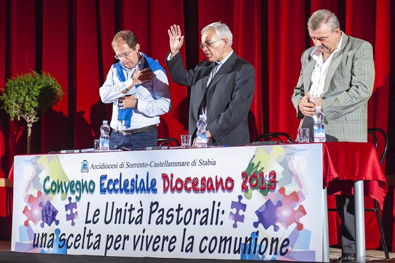 Gianfranco Aprea e Tonino Esposito hanno poi ricordato le prossime fasi del convegno ecclesiale. Fino al 24 ottobre le comunità sono invitate a fare esercizi di comunione. In particolare, i consigli pastorali parrocchiali sono invitati a riunirsi almeno una volta. Durante lincontro si porranno due domande: A che punto siamo nella vita di comunione? Come viviamo la corresponsabilità?. I consigli delle Unità pastorali si dovranno incontrare almeno due volte. Nel primo incontro si condivideranno le conclusioni dei consigli parrocchiali e si rifletterà su tre aspetti: A che punto siamo nella vita di comunione? Come la nostra Unità aiuta le parrocchie a crescere nella comunione? Le relazioni e i rapporti tra Unità, Zone e Diocesi, con ipotesi di collaborazione le une per le altre. Nel secondo incontro ci sarà la condivisione delle conclusioni da presentare alla seconda fase del convegno, che sarà un Incontro residenziale allHotel Stabia di Castellammare di Stabia, dalle ore 15 del 25 ottobre alle ore 19 del 26 ottobre. La terza fase è rappresentata da una riunione congiunta del Consiglio pastorale diocesano e del Consiglio presbiterale e dalla celebrazione eucaristica conclusiva, sabato 23 novembre, Primi Vespri di Cristo Re, alle ore 18, nella cattedrale di Sorrento.