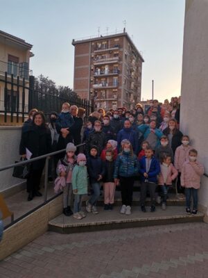 Ma nel frattempo, alcuni “prossimi” hanno bussato alla nostra porta. Due settimane dopo l’inizio della guerra, abbiamo accolto le prime due famiglie sul territorio della nostra parrocchia: due madri con i loro rispettivi bambini, ai quali cerchiamo di dare supporto e guida quotidiani. E poi, sabato 12 marzo, abbiamo accolto la terza famiglia, ospitata temporaneamente proprio nella nostra casa parrocchiale: una madre e due figli adolescenti. Ci siamo stretti intorno a loro con amore, rispetto, quasi devozione: ciascuno di noi, in parrocchia, sa di trovarsi dinnanzi ad un sacrario, fragile e delicato. Tutti gli uomini sono il “sacrario dello Spirito Santo”, ma i fragili lo sono un po’ di più. Lo stesso sabato sera, abbiamo organizzato un piccolo momento di conoscenza e convivialità fra gli adolescenti della nostra parrocchia e le famiglie ucraine. Cercheremo di moltiplicare questi momenti per cementificare le relazioni, creare delle reti, farci compagni di strada, perché nessuno si senta smarrito o abbandonato, ma integrato e valorizzato. Anche per questo motivo, ci stiamo attivando per la piena integrazione dei ragazzi nella scuola. Con le famiglie ucraine accolte in parrocchia, abbiamo vissuto un primo momento partecipando al flashmob della Scuola Di Capua martedì 15 marzo, che ha visto coinvolti i ragazzi e i bambini delle medie ed elementari, stretti in un convinto “sì” alla Pace, con le braccia spalancate verso i loro coetanei. Ma la solidarietà delle scuole non si è fermato a questo: Istituti come la Stabiae e la Di Capua hanno attivamente contribuito con raccolte di alimenti, medicinali e fondi da destinare alla popolazione ucraina. Proprio a proposito di scuola, abbiamo ideato dei corsi di lingua italiana per ucraini, divisi in fasce di età, il cui “kick-off” si è svolto martedì 22 marzo. Con semplicità e amore, abbiamo accolto più di 40 iscritti, fra bambini, giovani e adulti ucraini e ucraine desiderosi di imparare la lingua italiana, per migliorare nella comunicazione ed integrarsi ancora più pienamente nel nostro territorio. Anche questo è un umile servizio che alcuni professionisti della nostra Comunità hanno desiderato intraprendere, con l’obiettivo di seguire le modalità che Papa Francesco stesso ci indica: accogliere, proteggere, promuovere ed integrare.