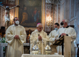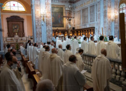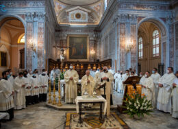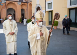 mai come quest’anno la celebrazione della Messa Crismale è stata attesa, desiderata, quasi richiesta con insistenza: la pausa forzata dello scorso anno non solo non la dimenticheremo facilmente, ma molto più ci ha permesso di prepararci a gustare con maggiore intensità la bellezza di questa solenne azione liturgica, unica per il suo valore simbolico e per la manifestazione sacramentale del mistero che ci è stato affidato perché il mondo creda. Siamo la Chiesa di Cristo, resa santa dal suo Spirito che abita in noi! Membra scelte del suo Corpo, donato dall’alto della Croce perché tutti abbiano la vita! Parte viva del Popolo di Dio, pellegrino in questa terra benedetta e perciò testimone coraggioso del Risorto, unica speranza dell’umanità! Radunati tutti insieme, il vescovo con i presbiteri e i diaconi, con i seminaristi e i rappresentanti della vita consacrata e dei fedeli laici, portiamo con noi il peso e la fatica di questo tempo di prova. Sentiamo il bisogno di essere aiutati, sostenuti, rafforzati. Dinanzi alle tante paure e angosce, che stiamo condividendo con la nostra gente, non ci siamo fermati né è prevalso il senso di pessimismo o di resa. Oggi vogliamo proclamare ad alta voce la fedeltà del Signore, cantare con gioia il suo amore infinito, invocare con fiducia il suo Nome misericordioso. Non è nostra l’iniziativa, non ne saremmo umanamente capaci. Come sempre, celebrando l’Eucaristia noi rispondiamo a un invito: siamo stati convocati e ci lasciamo attrarre da Lui, il Signore Gesù, dal quale riceviamo “grazia e pace” e che acclamiamo come “il testimone fedele, il primogenito dei morti, il sovrano dei re della terra” (Ap 1,5).
