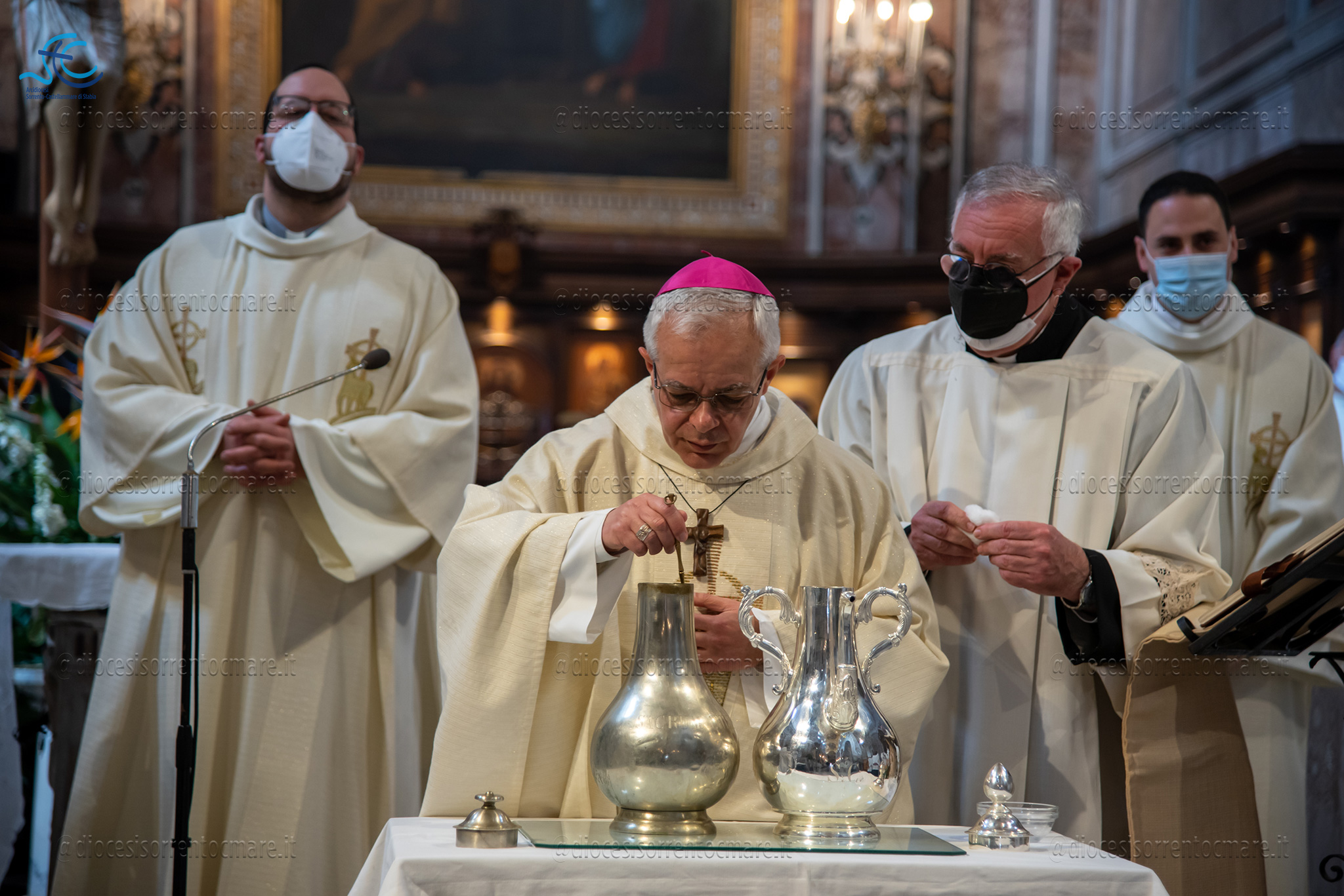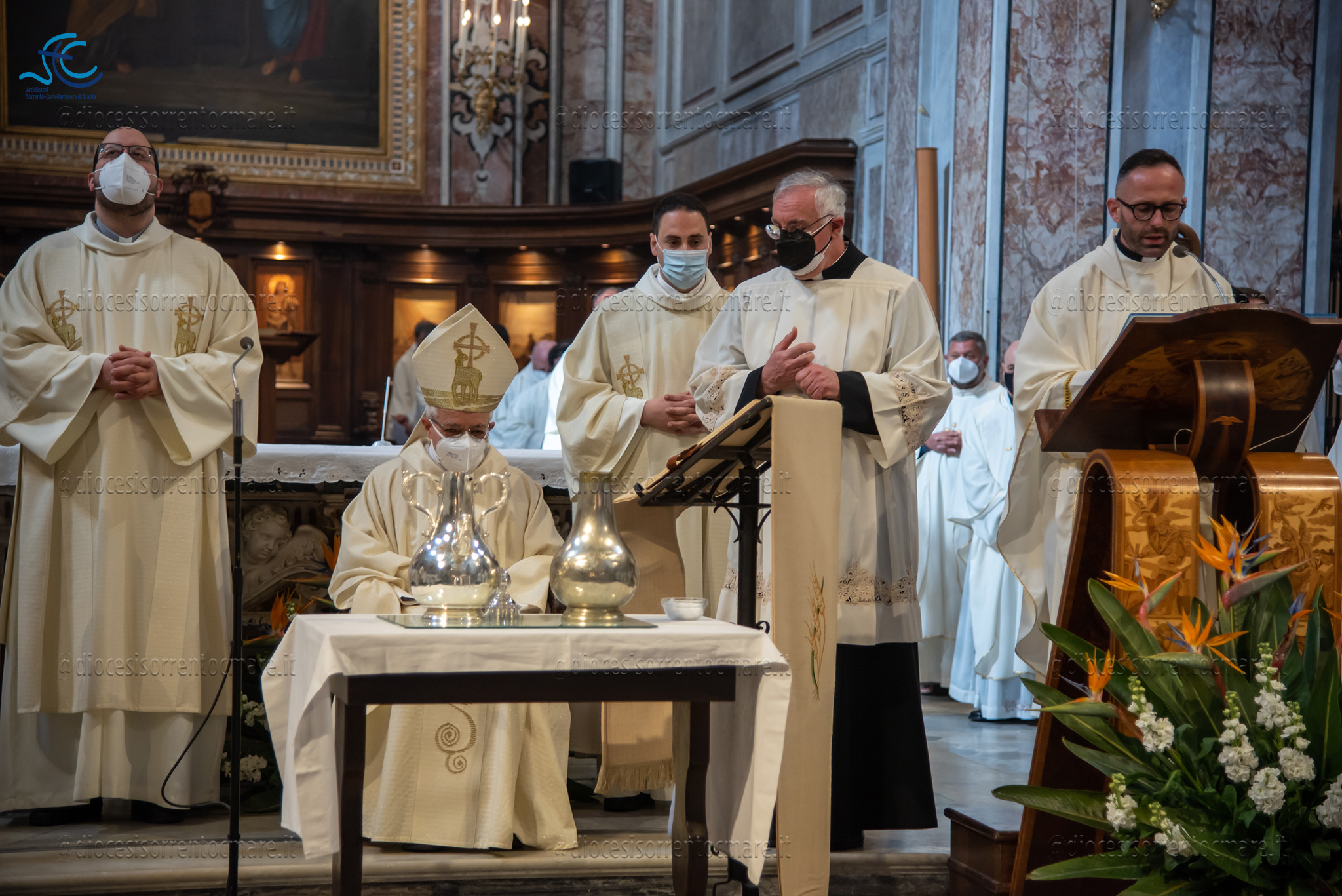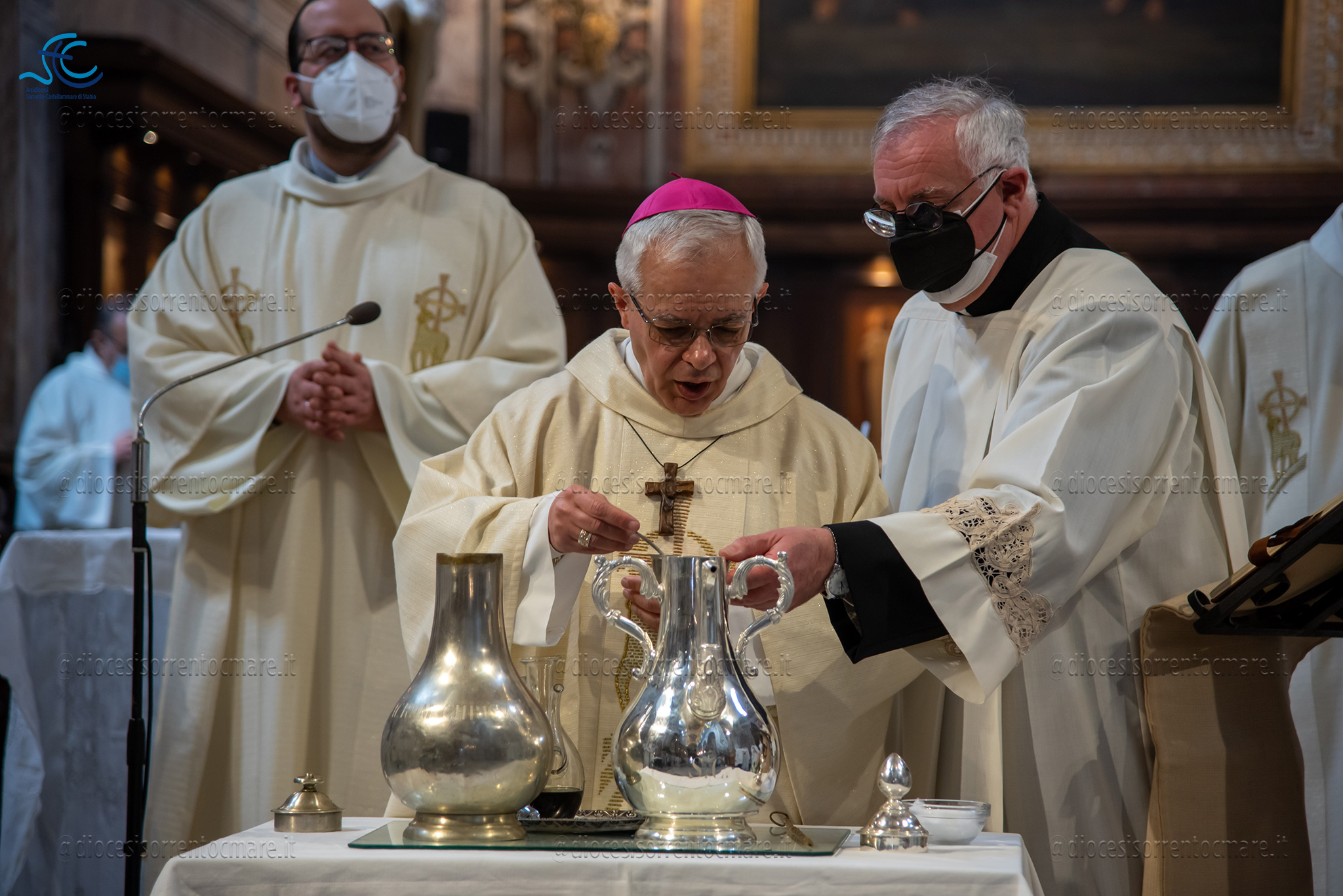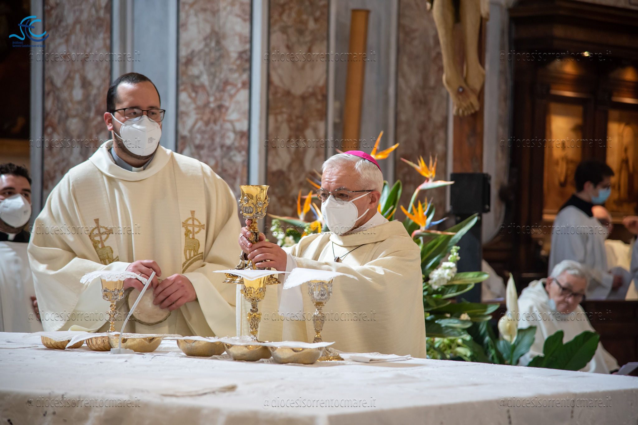 Tra poco, carissimi, benediremo l’Olio degli Infermi perché conforti quanti sono nella sofferenza, l’Olio dei catecumeni perché rinascano a vita nuova nella Chiesa, e l’Olio per il sacro Crisma perché tutto il Popolo di Dio sia consacrato e reso partecipe della missione di Cristo. Nel rito esprimeremo ciò che siamo, per puro dono divino, e ciò che ci impegniamo a diventare, per nostra crescente responsabilità. Riascoltiamo dunque le parole del profeta Isaia, che Gesù ha fatto sue a Nazàret e che oggi riconsegna a noi tutti qui riuniti per rappresentare la Chiesa pellegrina in Sorrento-Castellammare di Stabia: “per questo mi ha consacrato con l’unzione” (Lc 4, 18). Ecco come siamo aiutati a camminare sulle vie della missione e della profezia: il dono dell’unità ci costituisce nella liturgia come l’unico Corpo di Cristo, affinché possiamo testimoniare nella storia del nostro tempo la sua azione salvifica. È Lui che ci dà forza nella prova. È Lui che ci unisce a sé facendo armonia delle nostre diversità. È Lui che ci invia nel mondo perché nessuno resti prigioniero del male. La varietà di carismi e ministeri deve essere sempre più riconosciuta, valorizzata, promossa. Solo una ministerialità diffusa ci consentirà di esprimere la ricchezza dei doni ricevuti e la gioia di metterli al servizio di tutti, in particolare di quanti sono oppressi dalle tante forme di schiavitù che oggi vanno diffondendosi. Come non chiedere a Voi, amatissimi consacrati e consacrate, di far brillare il carisma della vostra vocazione alla santità? Voi lo sapete: non è per Voi stessi o solo per le Vostre famiglie religiose che siete chiamati a vivere la fraternità. È un’anticipazione del Regno, un segno escatologico della vita nuova in Cristo, un annuncio profetico dell’unità di tutto il genere umano che la Chiesa deve contribuire ad affrettare. Voi occupate un posto speciale nel cuore di Cristo e in quello di ciascuno di noi!