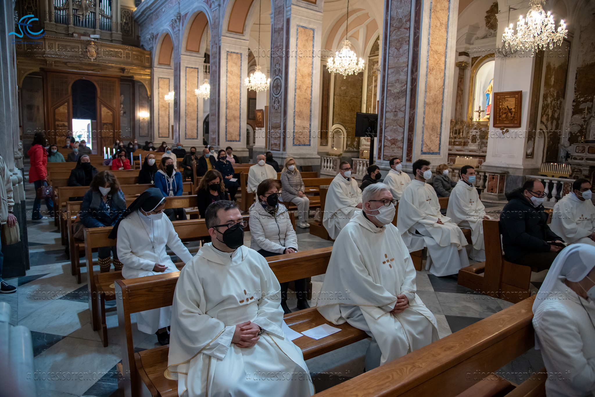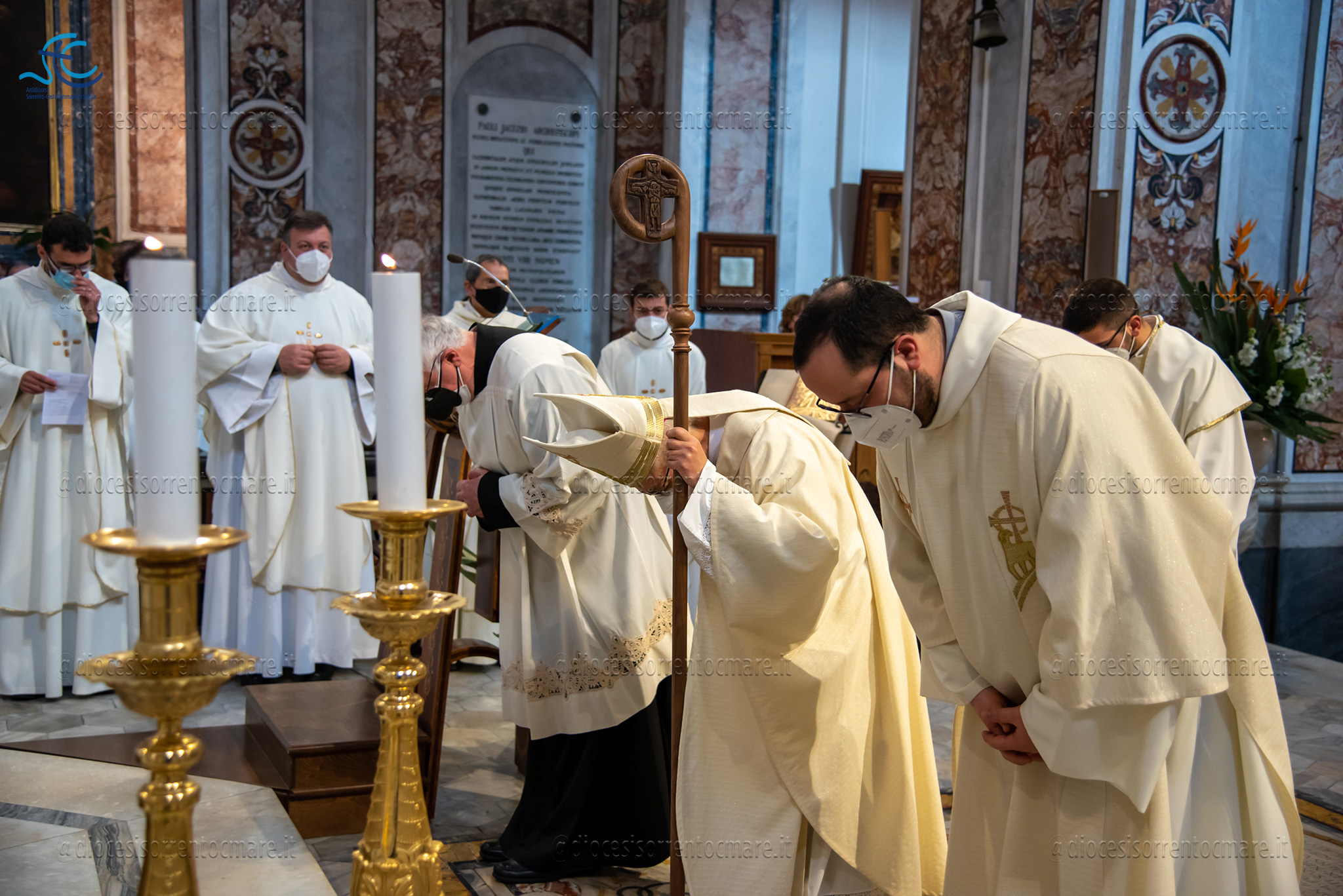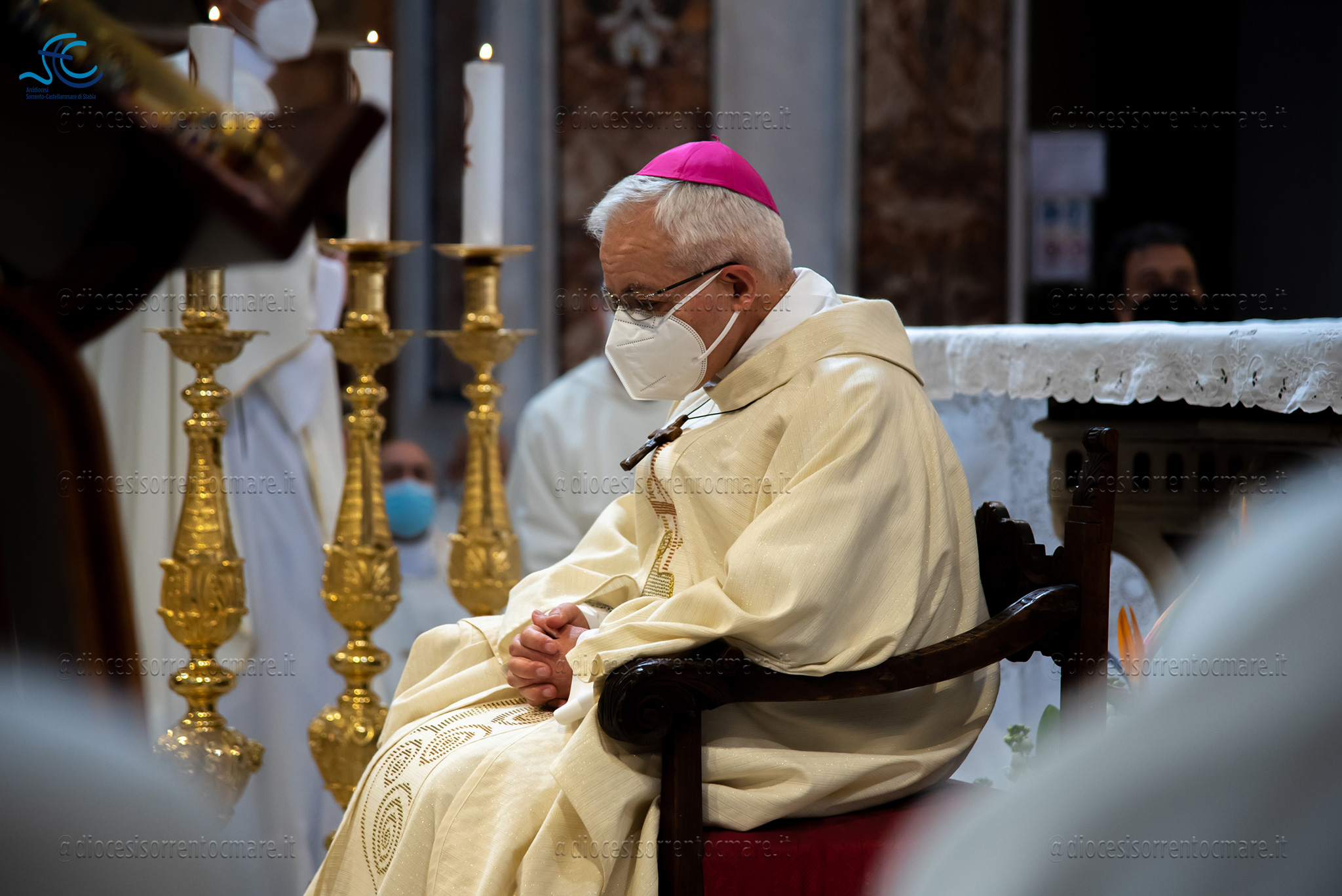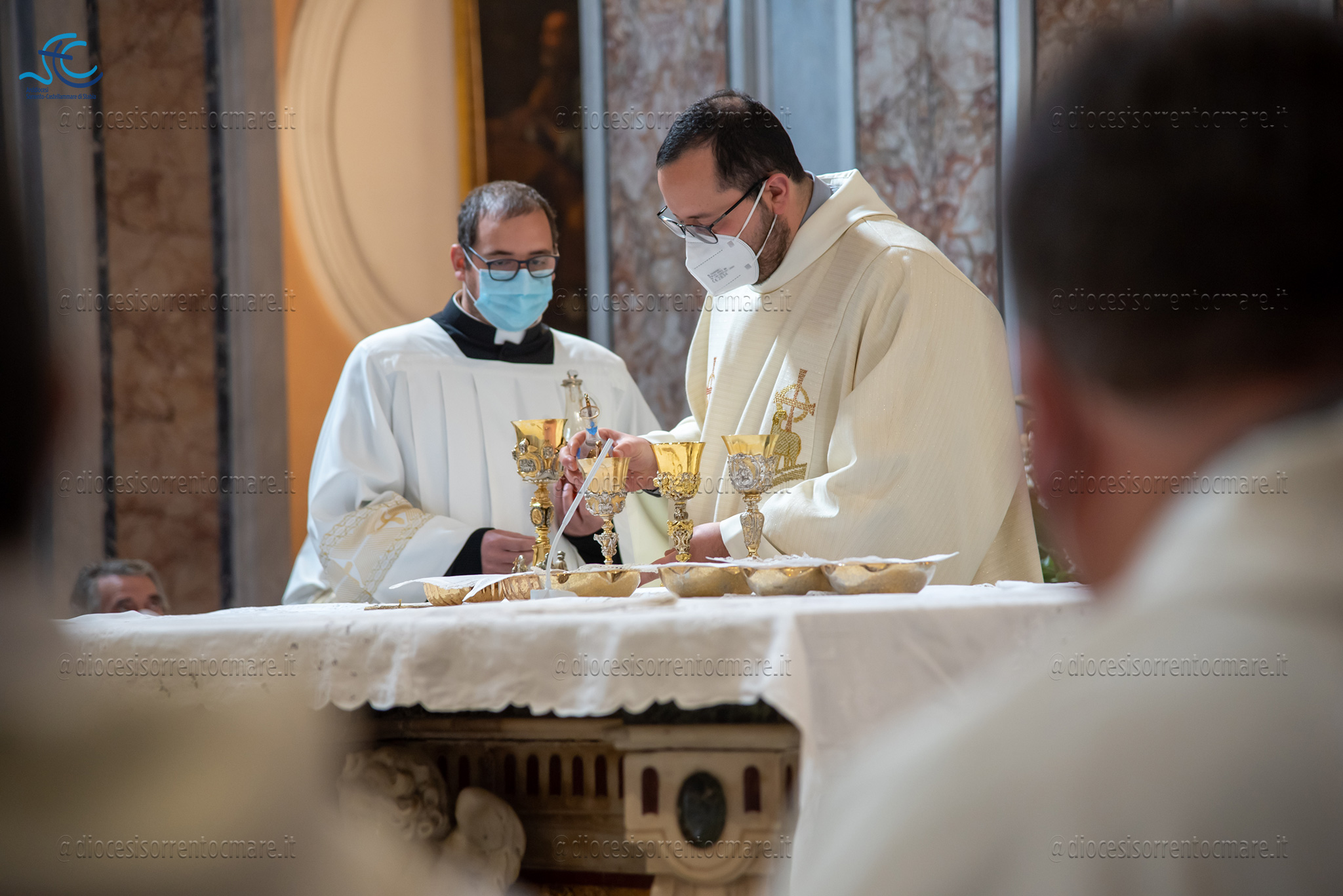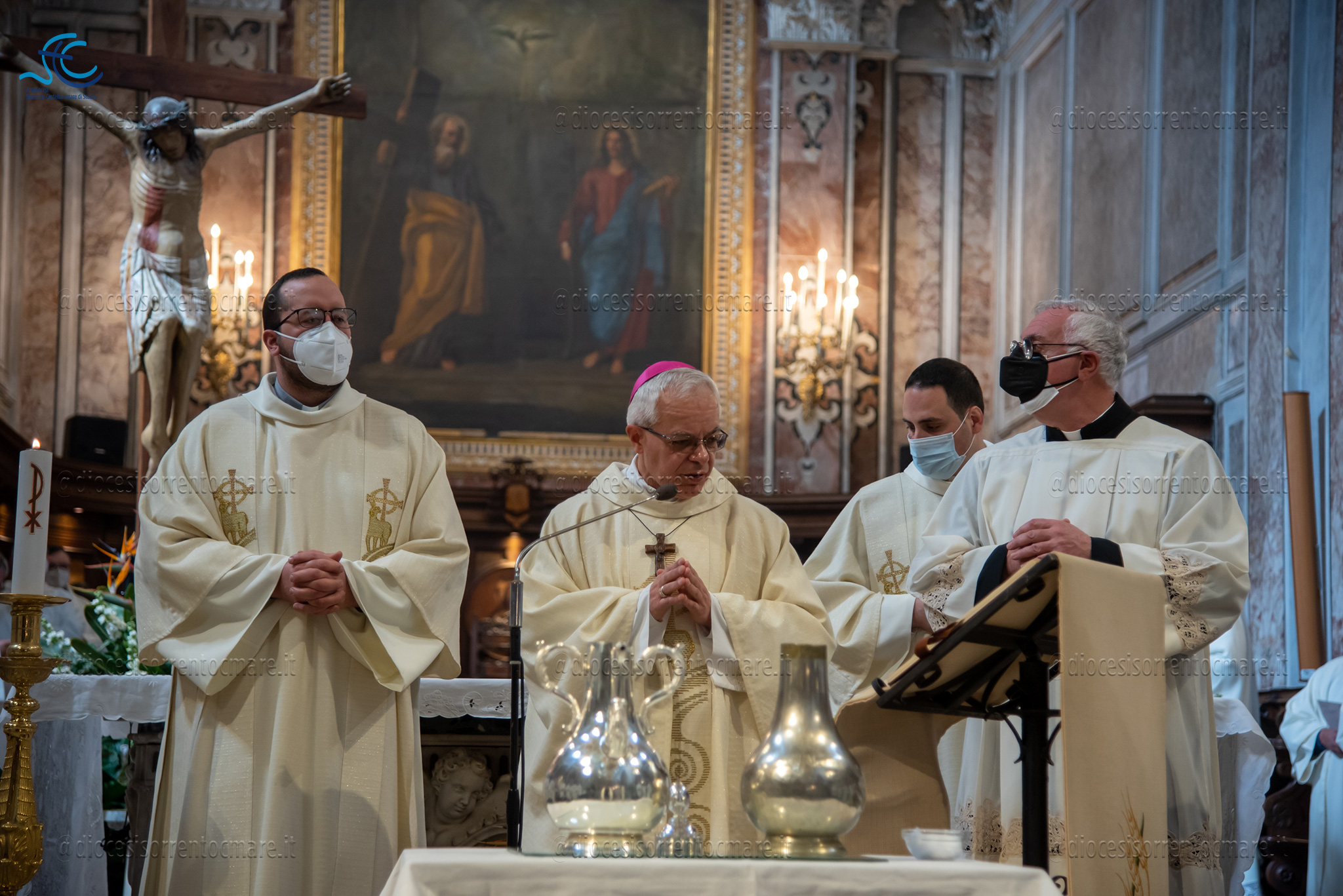 Tra poco, carissimi, benediremo l’Olio degli Infermi perché conforti quanti sono nella sofferenza, l’Olio dei catecumeni perché rinascano a vita nuova nella Chiesa, e l’Olio per il sacro Crisma perché tutto il Popolo di Dio sia consacrato e reso partecipe della missione di Cristo. Nel rito esprimeremo ciò che siamo, per puro dono divino, e ciò che ci impegniamo a diventare, per nostra crescente responsabilità. Riascoltiamo dunque le parole del profeta Isaia, che Gesù ha fatto sue a Nazàret e che oggi riconsegna a noi tutti qui riuniti per rappresentare la Chiesa pellegrina in Sorrento-Castellammare di Stabia: “per questo mi ha consacrato con l’unzione” (Lc 4, 18). Ecco come siamo aiutati a camminare sulle vie della missione e della profezia: il dono dell’unità ci costituisce nella liturgia come l’unico Corpo di Cristo, affinché possiamo testimoniare nella storia del nostro tempo la sua azione salvifica. È Lui che ci dà forza nella prova. È Lui che ci unisce a sé facendo armonia delle nostre diversità. È Lui che ci invia nel mondo perché nessuno resti prigioniero del male. La varietà di carismi e ministeri deve essere sempre più riconosciuta, valorizzata, promossa. Solo una ministerialità diffusa ci consentirà di esprimere la ricchezza dei doni ricevuti e la gioia di metterli al servizio di tutti, in particolare di quanti sono oppressi dalle tante forme di schiavitù che oggi vanno diffondendosi. Come non chiedere a Voi, amatissimi consacrati e consacrate, di far brillare il carisma della vostra vocazione alla santità? Voi lo sapete: non è per Voi stessi o solo per le Vostre famiglie religiose che siete chiamati a vivere la fraternità. È un’anticipazione del Regno, un segno escatologico della vita nuova in Cristo, un annuncio profetico dell’unità di tutto il genere umano che la Chiesa deve contribuire ad affrettare. Voi occupate un posto speciale nel cuore di Cristo e in quello di ciascuno di noi!