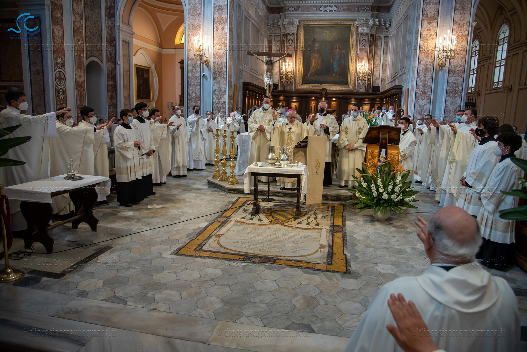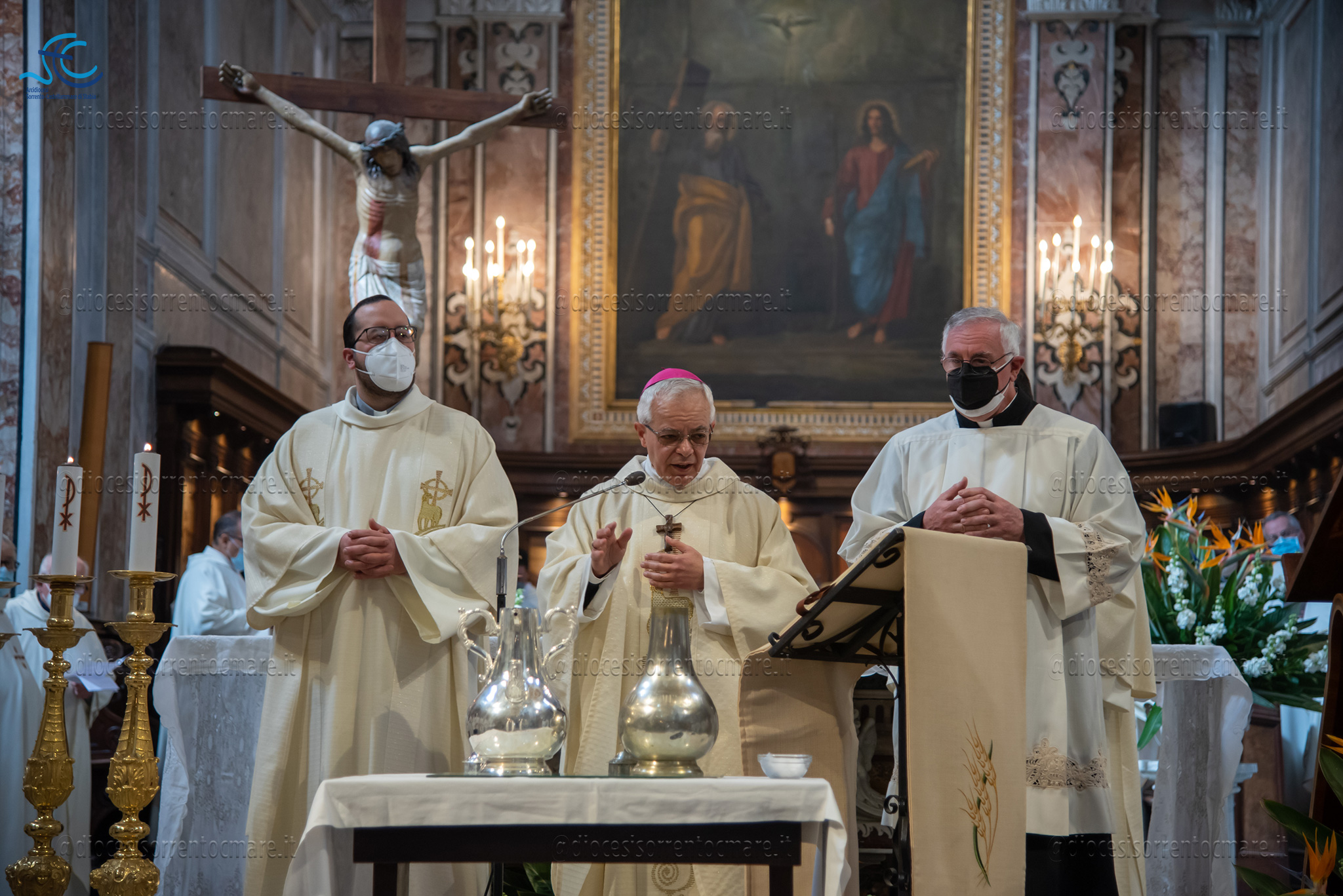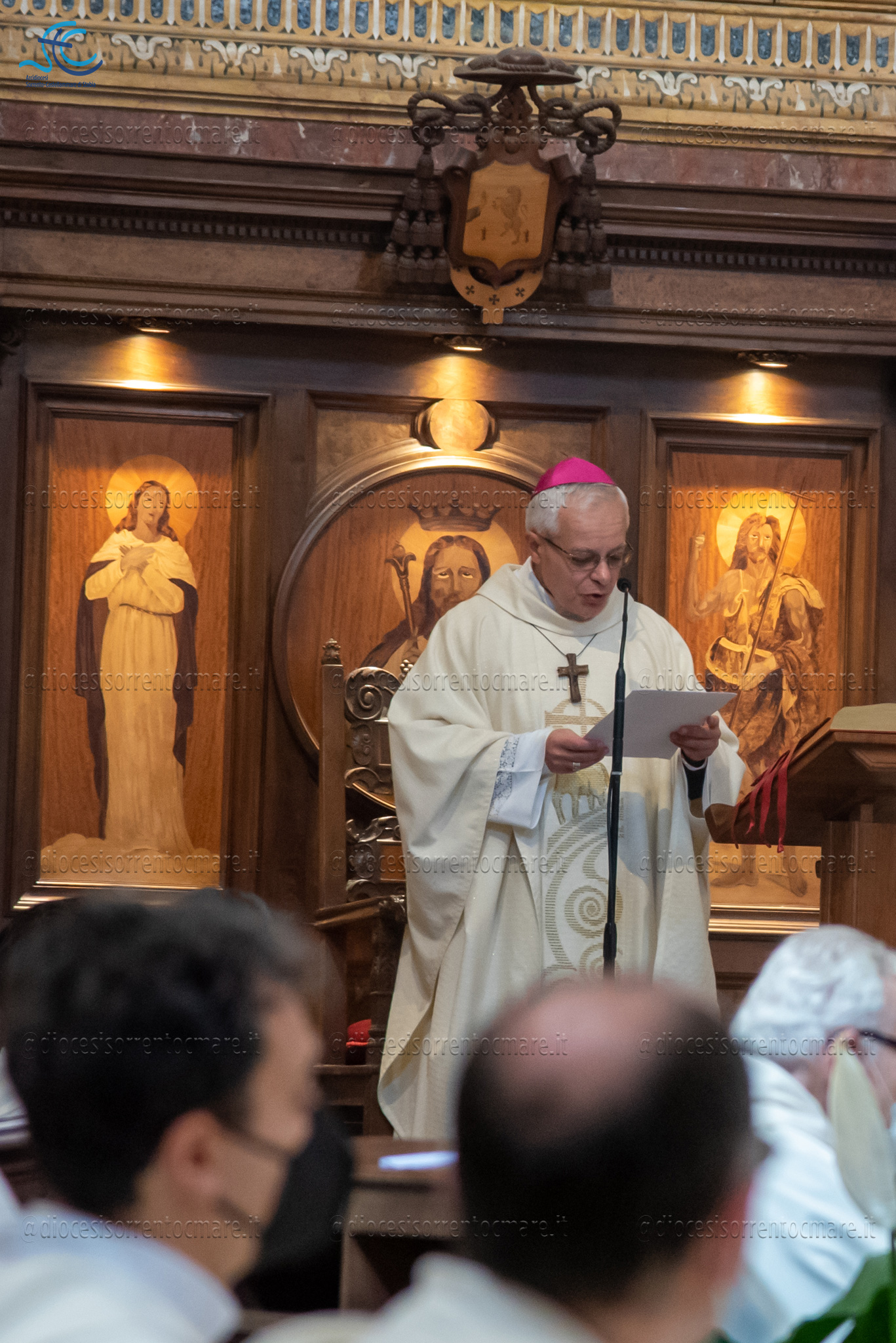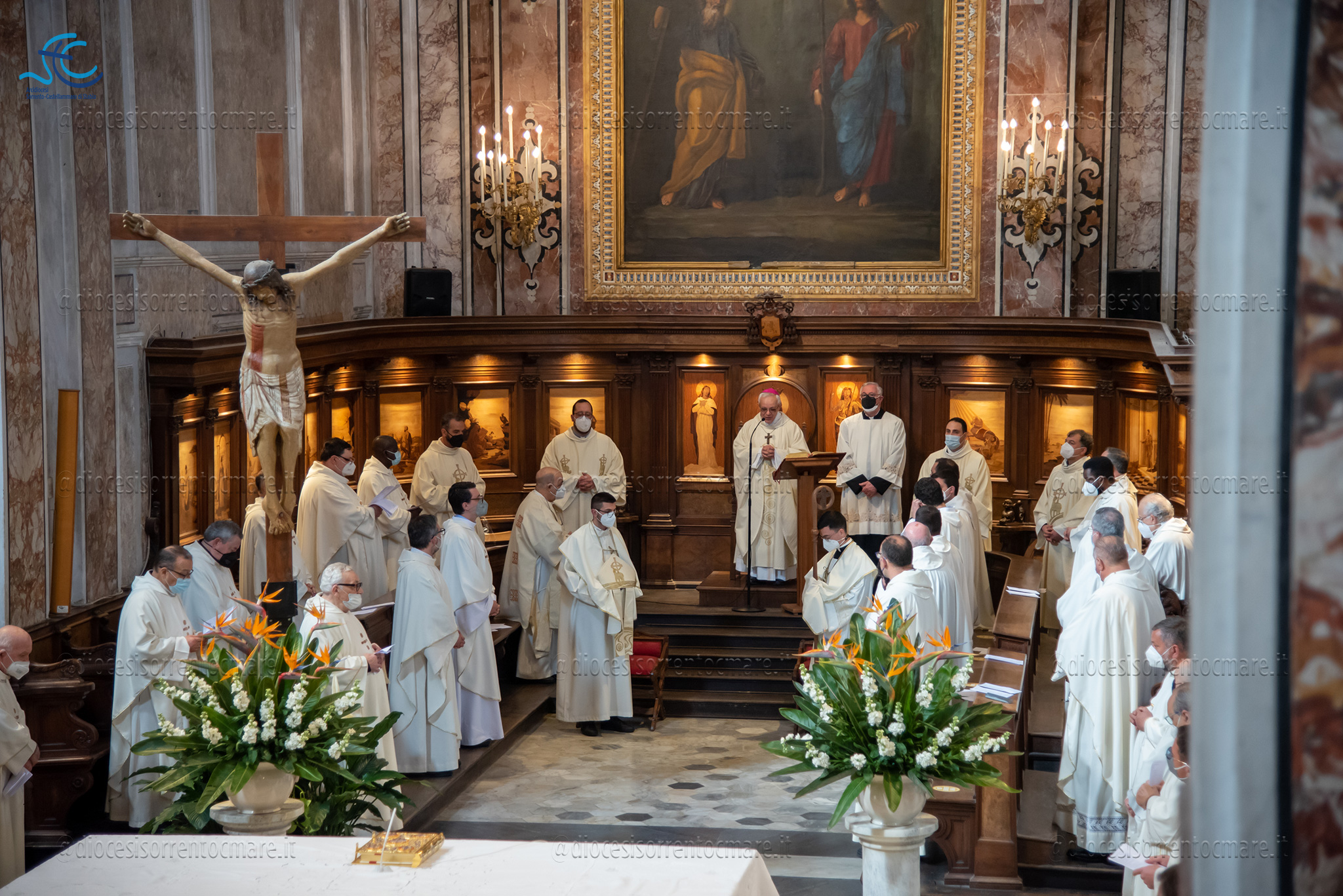 Tra poco, carissimi, benediremo l’Olio degli Infermi perché conforti quanti sono nella sofferenza, l’Olio dei catecumeni perché rinascano a vita nuova nella Chiesa, e l’Olio per il sacro Crisma perché tutto il Popolo di Dio sia consacrato e reso partecipe della missione di Cristo. Nel rito esprimeremo ciò che siamo, per puro dono divino, e ciò che ci impegniamo a diventare, per nostra crescente responsabilità. Riascoltiamo dunque le parole del profeta Isaia, che Gesù ha fatto sue a Nazàret e che oggi riconsegna a noi tutti qui riuniti per rappresentare la Chiesa pellegrina in Sorrento-Castellammare di Stabia: “per questo mi ha consacrato con l’unzione” (Lc 4, 18). Ecco come siamo aiutati a camminare sulle vie della missione e della profezia: il dono dell’unità ci costituisce nella liturgia come l’unico Corpo di Cristo, affinché possiamo testimoniare nella storia del nostro tempo la sua azione salvifica. È Lui che ci dà forza nella prova. È Lui che ci unisce a sé facendo armonia delle nostre diversità. È Lui che ci invia nel mondo perché nessuno resti prigioniero del male. La varietà di carismi e ministeri deve essere sempre più riconosciuta, valorizzata, promossa. Solo una ministerialità diffusa ci consentirà di esprimere la ricchezza dei doni ricevuti e la gioia di metterli al servizio di tutti, in particolare di quanti sono oppressi dalle tante forme di schiavitù che oggi vanno diffondendosi. Come non chiedere a Voi, amatissimi consacrati e consacrate, di far brillare il carisma della vostra vocazione alla santità? Voi lo sapete: non è per Voi stessi o solo per le Vostre famiglie religiose che siete chiamati a vivere la fraternità. È un’anticipazione del Regno, un segno escatologico della vita nuova in Cristo, un annuncio profetico dell’unità di tutto il genere umano che la Chiesa deve contribuire ad affrettare. Voi occupate un posto speciale nel cuore di Cristo e in quello di ciascuno di noi!