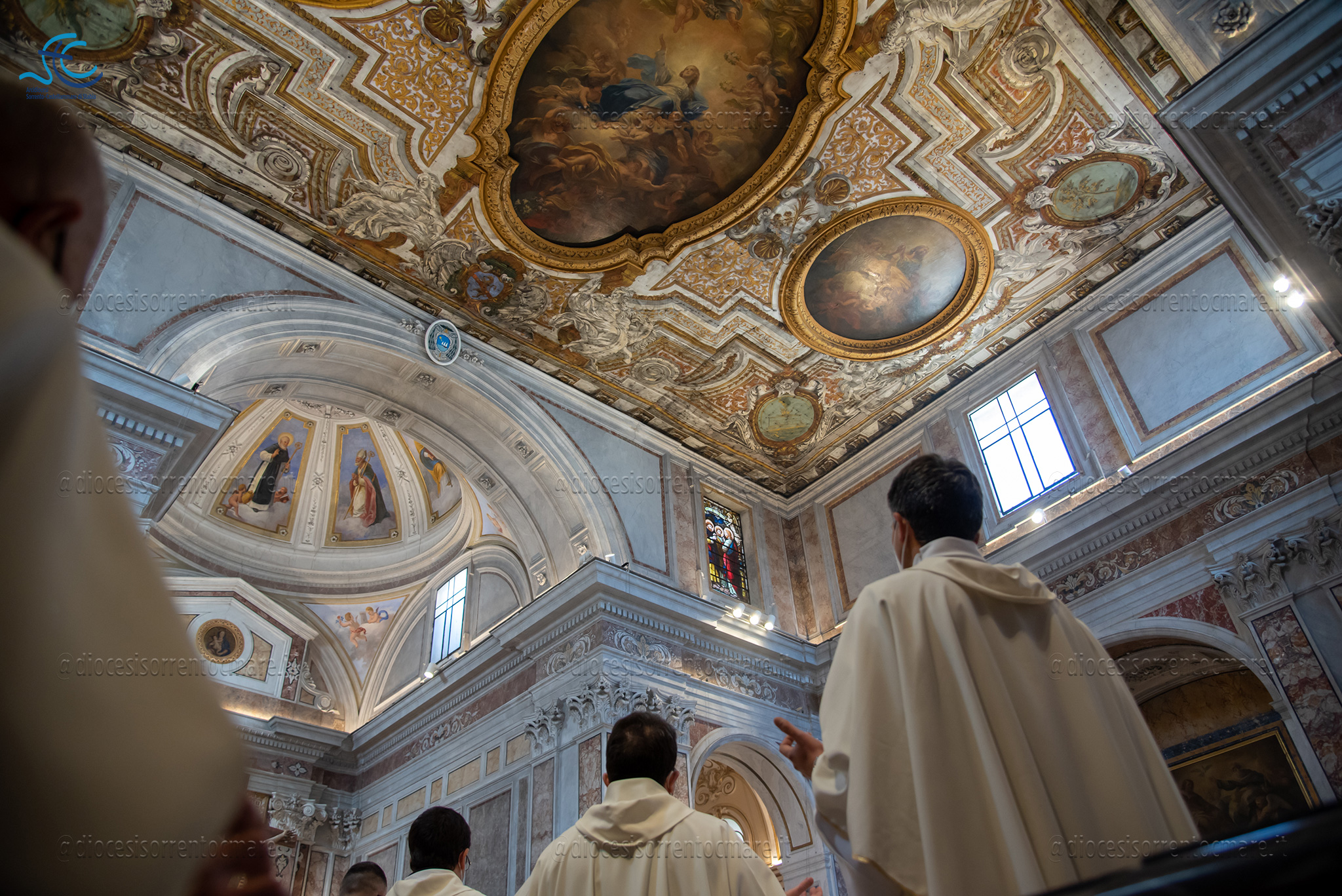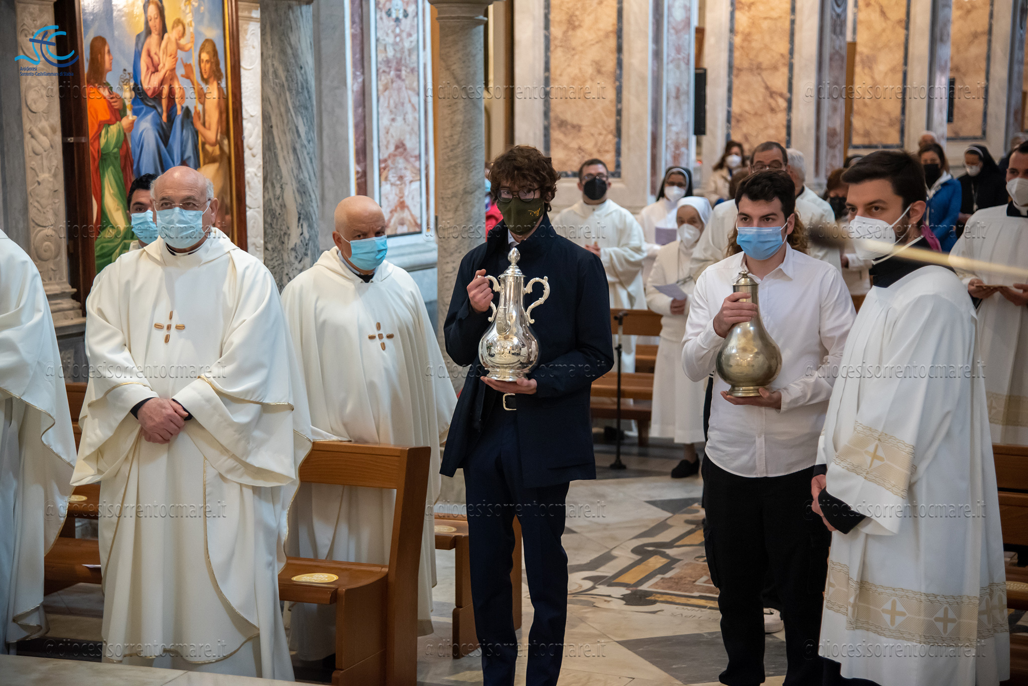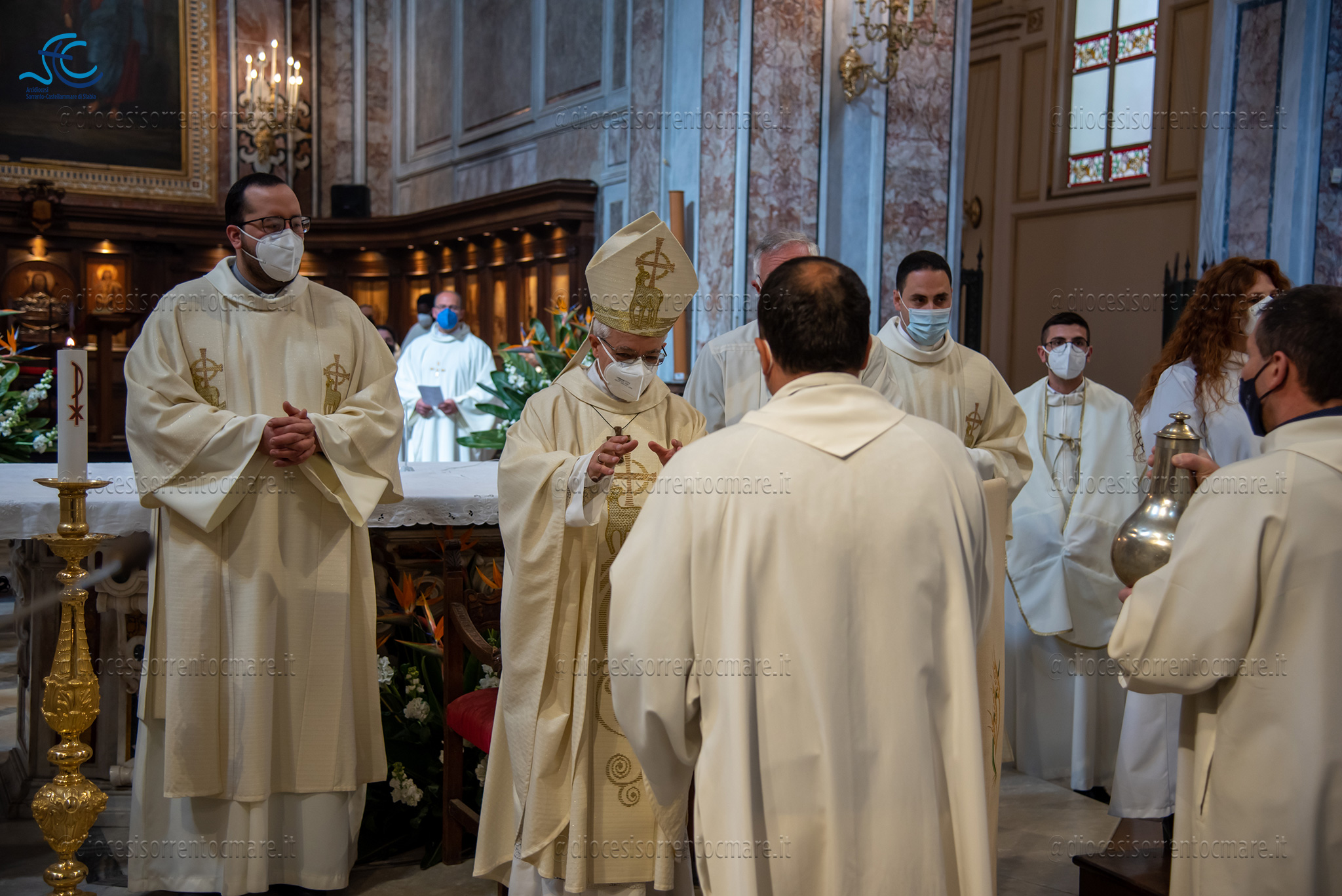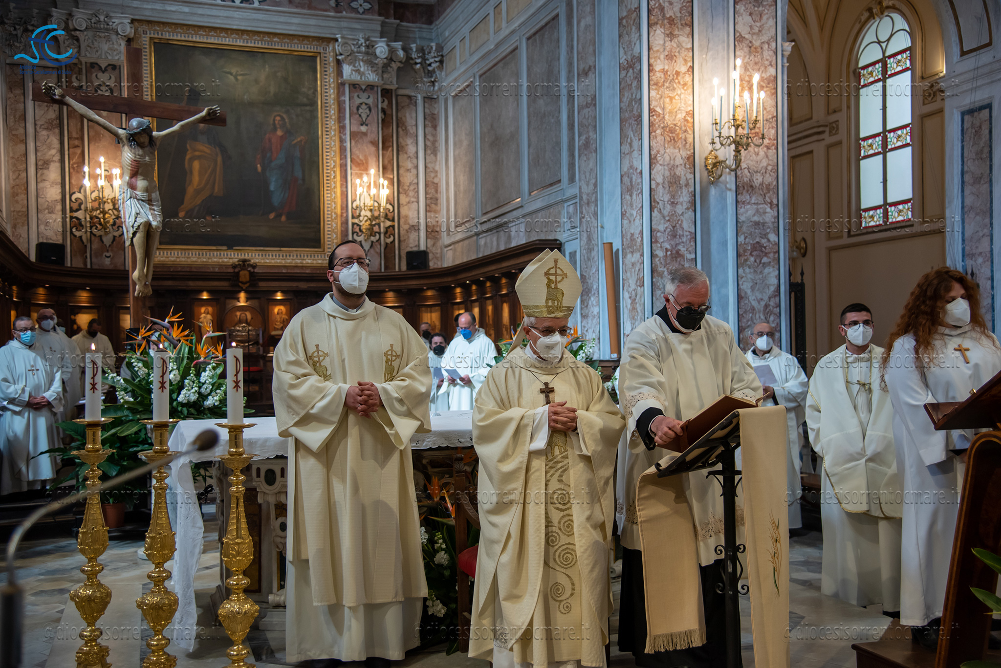I rintocchi della Campane si sentono più forte in una Sorrento più vuota del solito. Tuniche bianche sono in cammino fuori il sagrato, la Croce risplende grazie ad un raggio di sole, l’Evangeliario la segue. Sacerdoti, diaconi, religiosi, religiose e pochi laici, hanno appena varcato l’ingresso della Cattedrale dei Santi Filippo e Giacomo. Eccole, arrivano le prime note del Gloria. Il triduo pasquale ha finalmente avuto inizio.