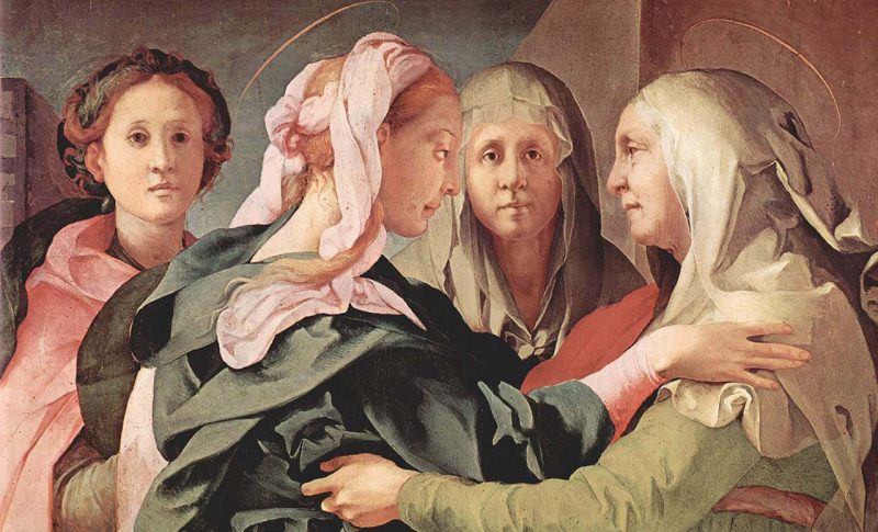 Entrata nella casa di Zaccarìa, salutò Elisabetta. Appena Elisabetta ebbe udito il saluto di Maria, il bambino sussultò nel suo grembo. Elisabetta fu colmata di Spirito Santo ed esclamò a gran voce: «Benedetta tu fra le donne e benedetto il frutto del tuo grembo! A che cosa devo che la madre del mio Signore venga da me? Ecco, appena il tuo saluto è giunto ai miei orecchi, il bambino ha sussultato di gioia nel mio grembo. E beata colei che ha creduto nelladempimento di ciò che il Signore le ha detto».