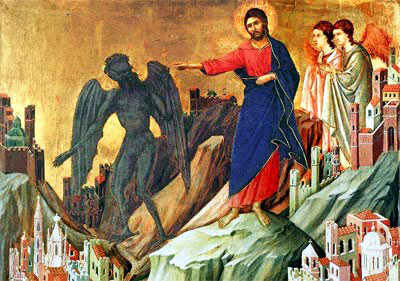Il diavolo lo condusse in alto, gli mostrò in un istante tutti i regni della terra e gli disse: «Ti darò tutto questo potere e la loro gloria, perché a me è stata data e io la do a chi voglio. Perciò, se ti prostrerai in adorazione dinanzi a me, tutto sarà tuo». Gesù gli rispose: «Sta scritto: Il Signore, Dio tuo, adorerai: a lui solo renderai culto».