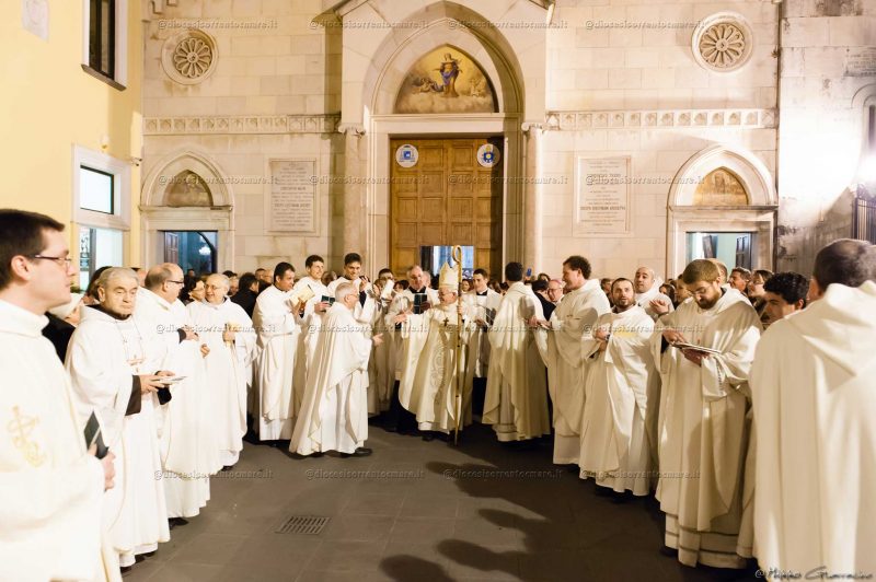 La cattedrale di Sorrento era gremitissima, mercoledì 1° aprile. Tutta la comunità diocesana, giovani, adulti, bambini, anziani, si è riunita intorno allarcivescovo, mons. Francesco Alfano, al vicario generale, don Mario Cafiero, ai sacerdoti, ai diaconi e ai seminaristi per una delle Messe più partecipate dellanno: la Messa crismale. Lappuntamento, come lanno scorso, è stato anticipato alla sera del Mercoledì Santo, in modo da permettere a un maggior numero di persone di partecipare. Quasi centoventi i sacerdoti che hanno concelebrato; presente anche il vescovo emerito, mons. Felice Cece. Molti anche i turisti, presenti per la Settimana Santa a Sorrento, che hanno partecipato alla Messa. Sullaltare splendevano le lampade come segno degli istituti religiosi presenti in diocesi, in questAnno della vita consacrata.