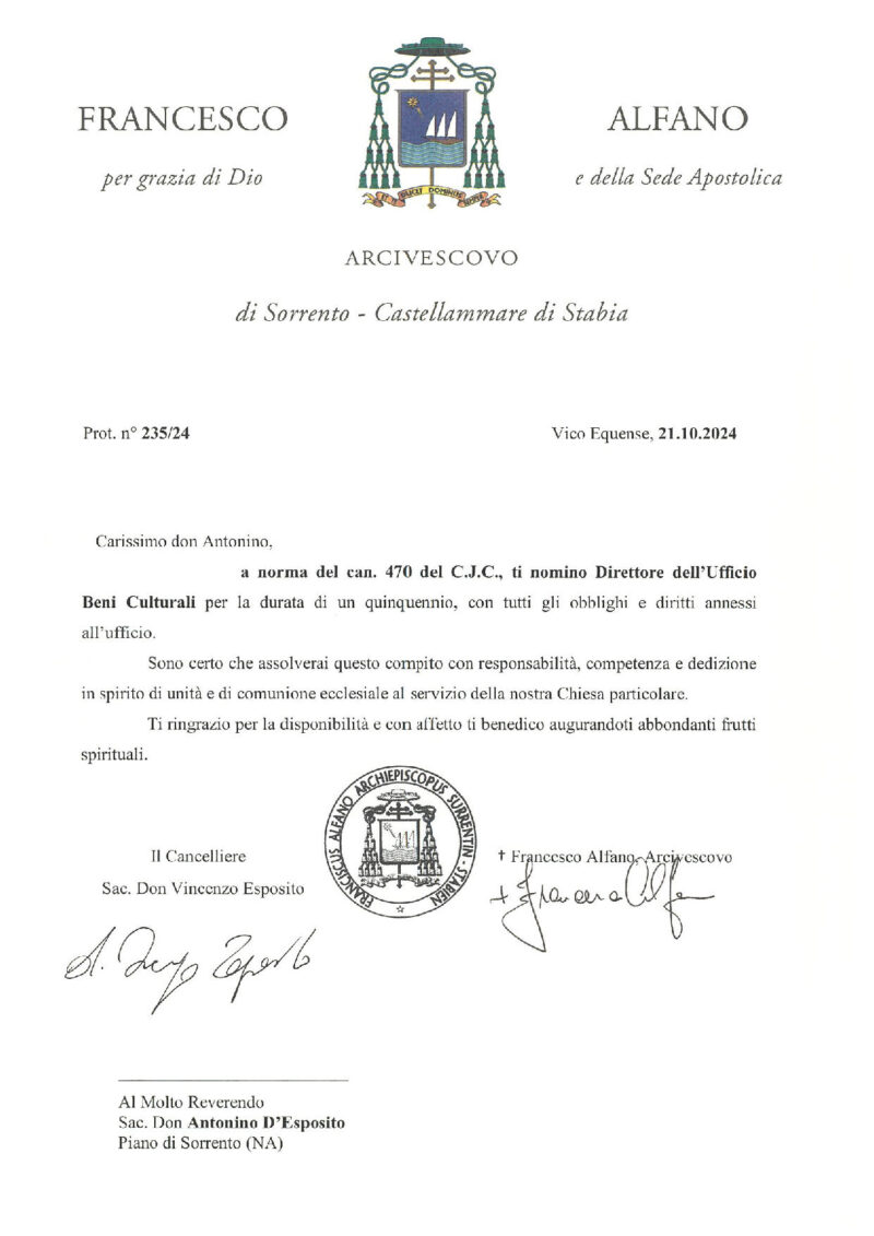 Nomine 21 Ottobre 2024 Nomina Direttore Ufficio Beni Culturali Don Antonino D’Esposito, in data 21 ottobre 2024, è stato nominato Direttore dell’Ufficio Beni Culturali. FacebookWhatsappGoogleTwitterLinkedinEmailPrint