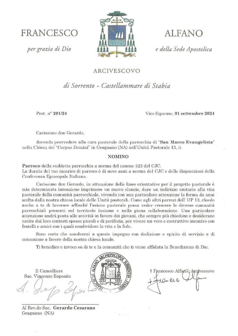 Avvisi per il Clero, Nomine 1 Settembre 2024 Nomina Parroco San Marco Evangelista, Gragnano Don Gerardo Cesarano, in data 01 settembre 2024, è stato nominato Parroco della parrocchia “San Marco Evangelista” nella chiesa del Corpus Domini in Gragnano. FacebookWhatsappGoogleTwitterLinkedinEmailPrint