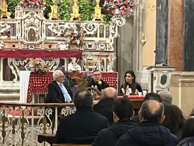 Dopo i saluti di Rossella Di Leva, consigliere comunale di Sorrento e del parroco della Cattedrale, don Carmine Giudici, Padre Enzo Fortunato ha dialogato con i giornalisti Simona Vanni e Antonino Siniscalchi.