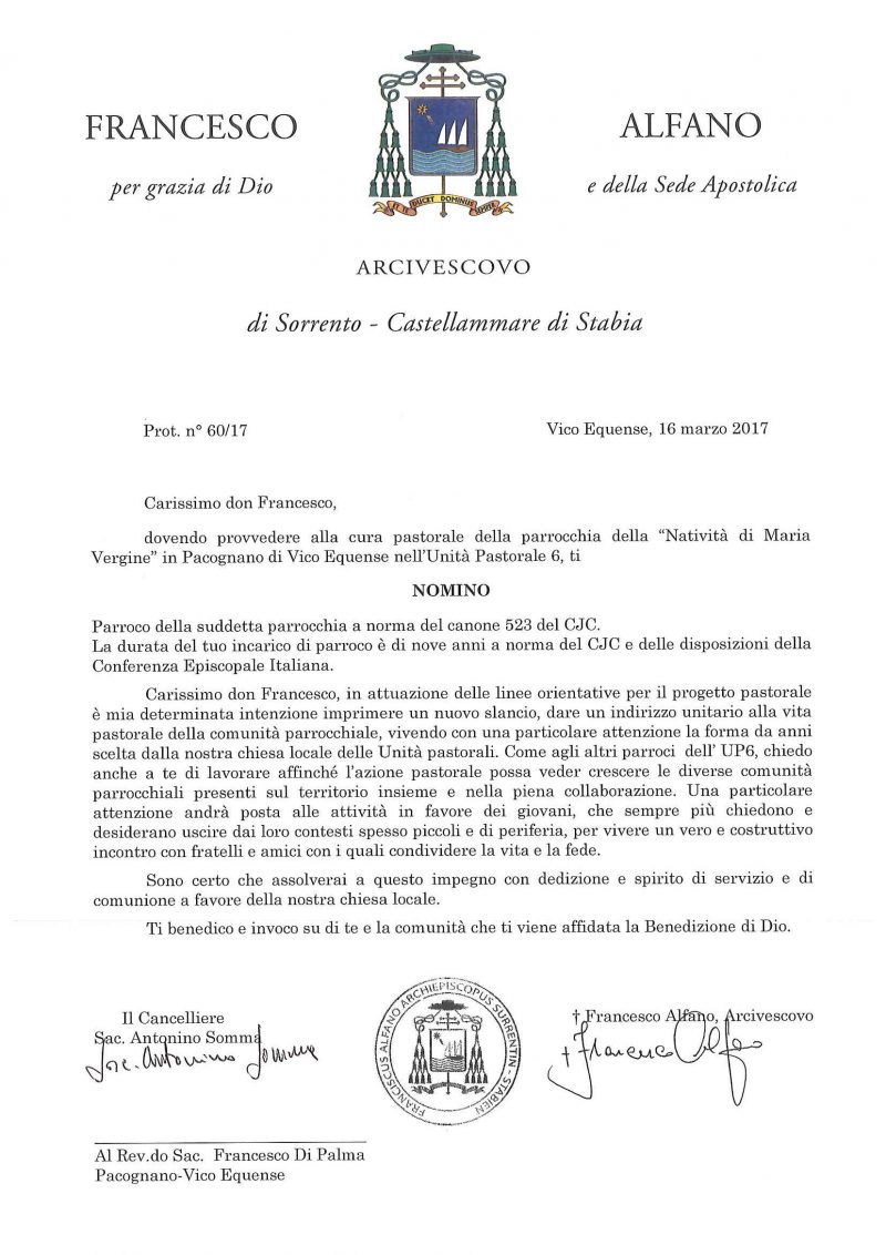 Nomine 16 Marzo 2017 Parroco per la Parrocchia Natività di Maria Vergine in Pacognano di Vico Equense Don Francesco Di Palma, in data 16 marzo 2017, è stato nominato Parroco della parrocchia Natività di Maria Vergine in Pacognano di Vico Equense. FacebookWhatsappGoogleTwitterLinkedinEmailPrint