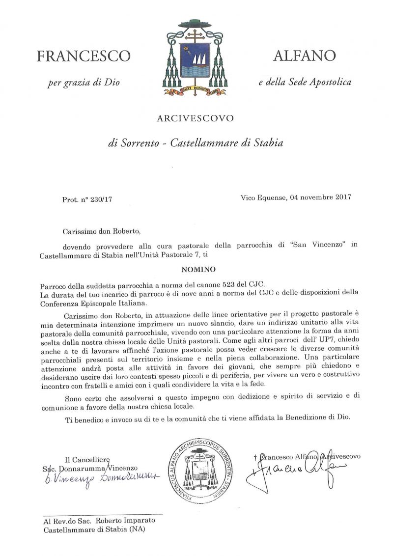 Nomine 4 Novembre 2017 Parroco per la Parrocchia San Vincenzo in Castellammare di Stabia Don Roberto Imparato, in data 04 novembre 2017, è stato nominato Parroco della parrocchia San Vincenzo in Castellammare di Stabia. FacebookWhatsappGoogleTwitterLinkedinEmailPrint