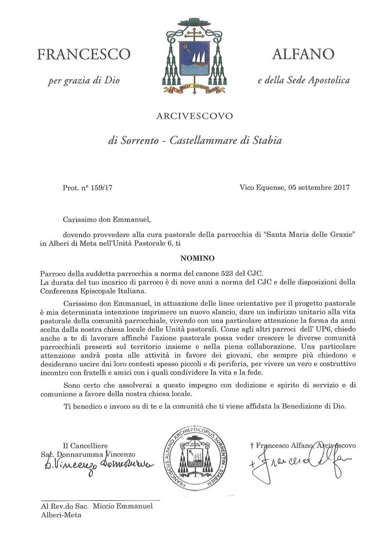 Nomine 5 Settembre 2017 Parroco per la Parrocchia Santa Maria delle Grazie – Alberi Meta Don Emmanuel Miccio, in data 5 settembre 2017, è stato nominato Parroco della parrocchia Santa Maria delle Grazie in Alberi Meta. FacebookWhatsappGoogleTwitterLinkedinEmailPrint