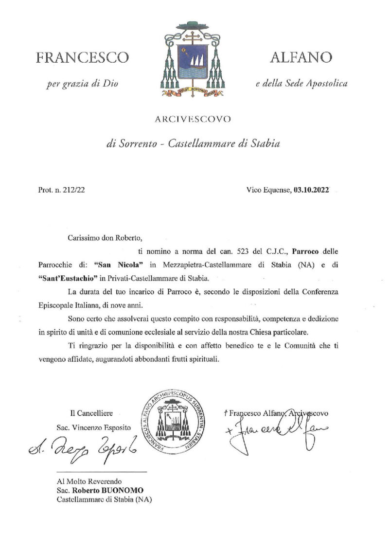 Don Roberto Buonomo, in data 03 ottobre 2022, è stato nominato Parroco delle parrocchie San Nicola e Sant’Eustachio, Castellammare di Stabia.