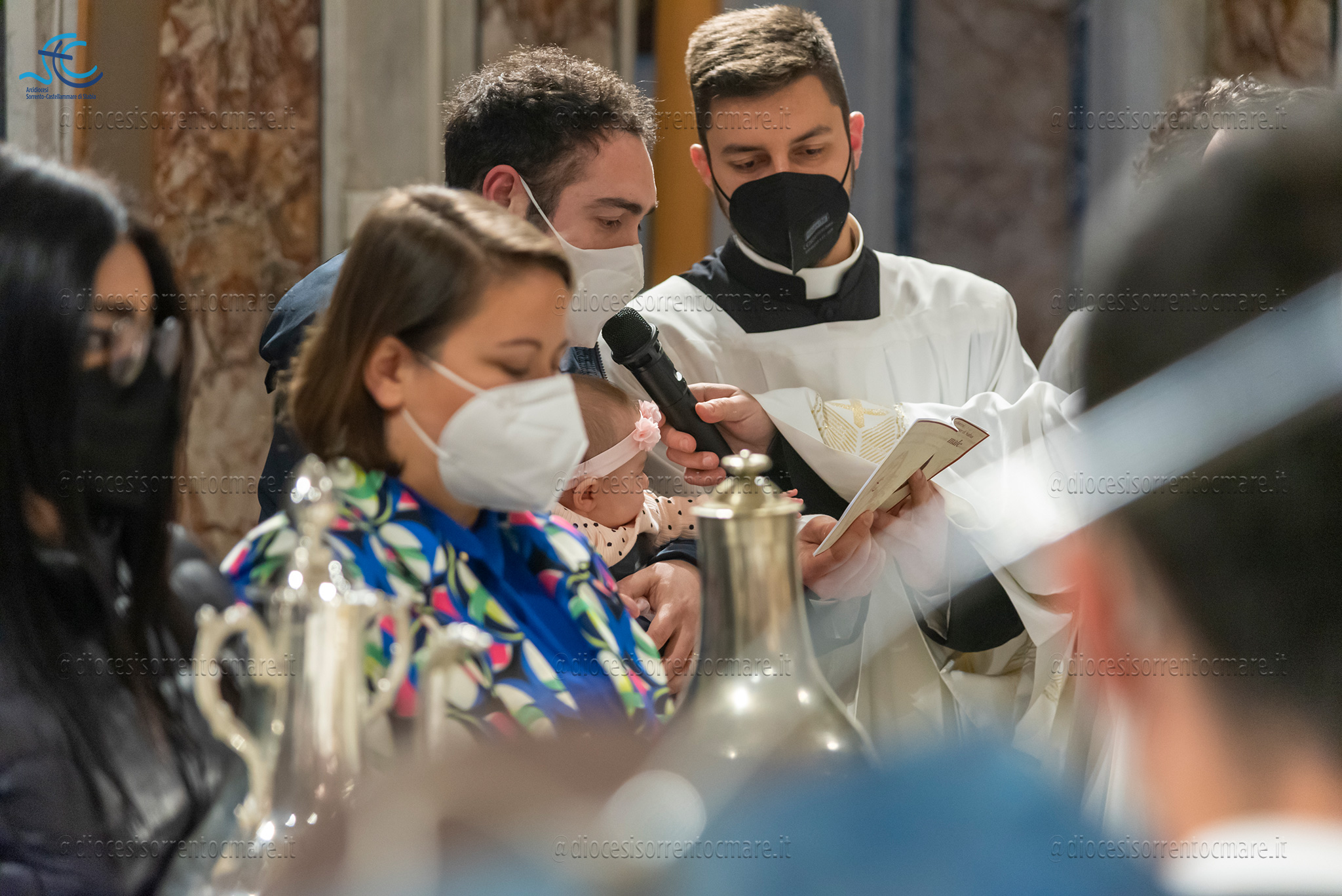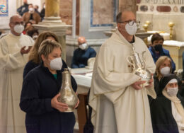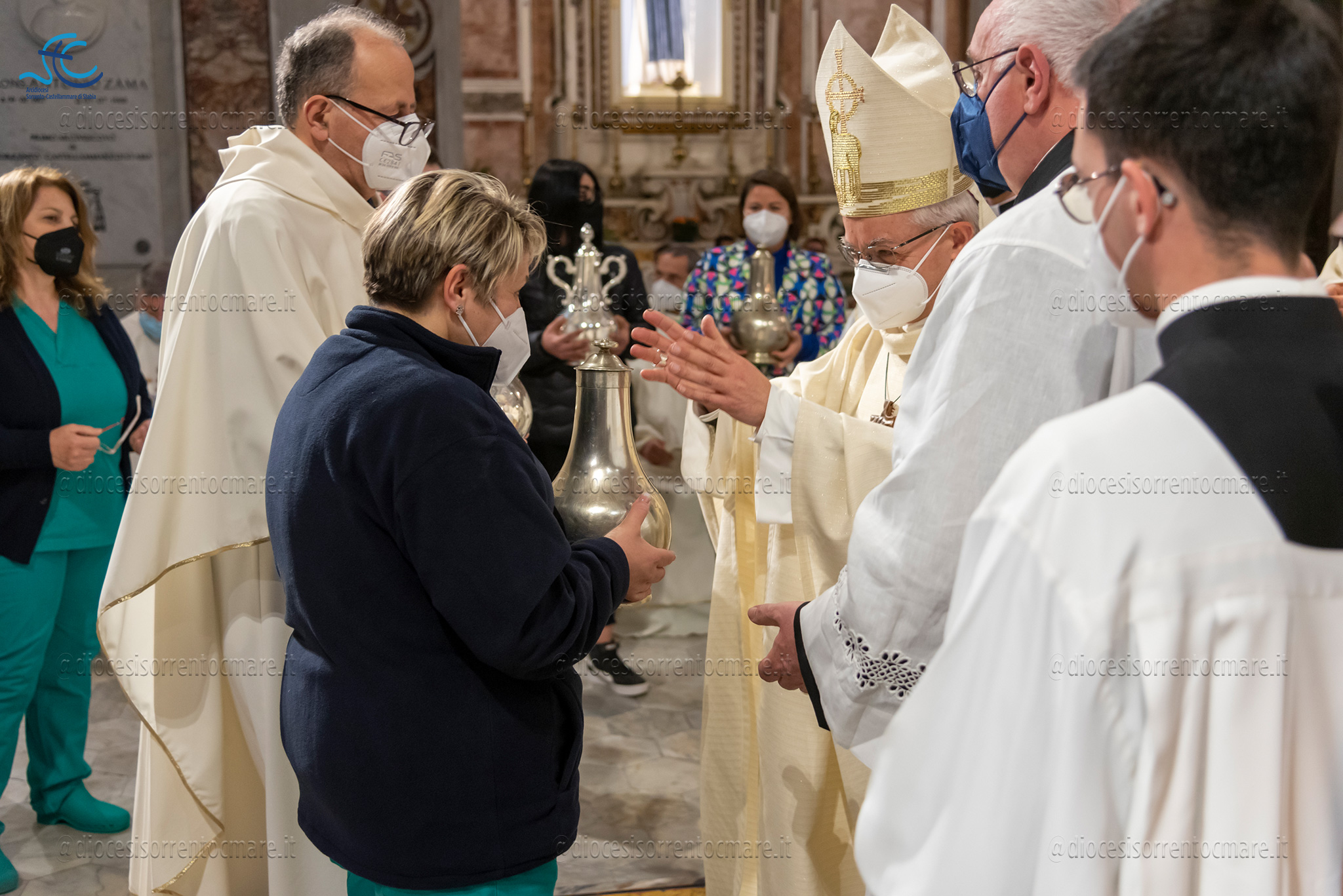 Emozionante il momento della benedizione degli oli, che si useranno durante tutto l’anno liturgico per la celebrazione dei sacramenti. Il crisma, usato nel battesimo, nella cresima e nell’ordinazione dei presbiteri e dei vescovi è stato consegnato da cresimandi della parrocchia di Sant’Agostino e Madonna di Lourdes di Castellammare di Stabia; l’olio dei catecumeni, usato nel battesimo è stato invece portare dinanzi al Vescovo da una famiglia il cui bambino riceverà il battesimo a Sant’Agnello nella veglia pasquale e da catecumeni che riceveranno l’iniziazione cristiana durante il periodo pasquale; ed infine la consegna dell’olio degli infermi è avvenuta da parte di operatori dell’ospedale di Sorrento e Don Salvatore Rossi cappellano dell’ospedale di Vico Equense.