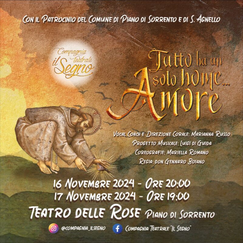 La Compagnia teatrale Il Segno, nata due decenni or sono, rilanciata dall’esperienza diocesana RENT reloaded (2024), e che in precedenza ha già messo in scena “I Miserabili”, e già nel 2012 “Tutto ha un solo nome, Amore”, ripropone, in occasione dell’ottavo centenario francescano del Cantico delle Creature e delle stigmate del santo di Assisi, il musical a lui dedicato per riproporne il messaggio universale di pace tra gli uomini e con il creato.