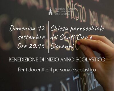 Domenica 12 alle 20:15 nella Parrocchia dei Santi Ciro e Giovanni in Vico Equense ci sarà un momento di preghiera per gli insegnanti, analogamente lunedì 13 alle 18:30 nella Chiesa del Carmine in Gragnano sarà celebrata una Santa Messa con gli insegnanti ed il personale scolastico per l’UP di Gragnano.