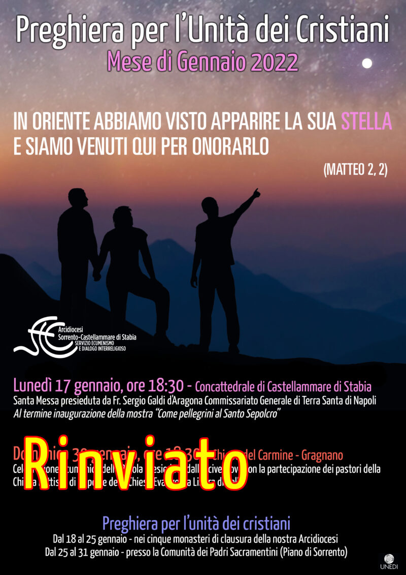 Domenica 30 gennaio il mese per l’unità dei cristiani si concluderà con una celebrazione ecumenica della Parola nella Chiesa del Carmine di Gragnano alle ore 18.30. Insieme al nostro Arcivescovo saranno presenti i pastori della Chiesa Battista di Napoli e della Chiesa Evangelica Libera di Volla. Sarà l’occasione per meditare insieme il testo degli Atti (At 10,1-48) che sta accompagnando da diversi anni il nostro cammino diocesano ed ora anche questo tempo sinodale.