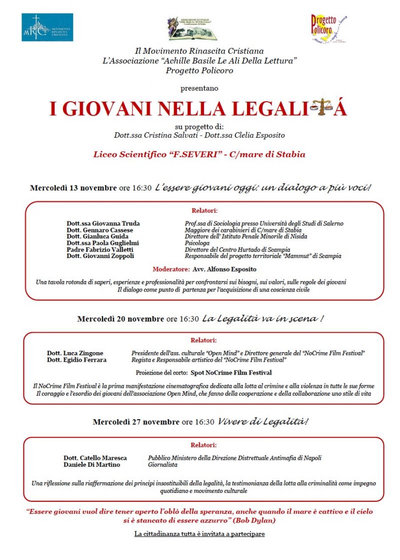 Il Progetto Policoro della nostra arcidiocesi, con il Movimento Rinascita Cristiana e l’Associazione Achille Basile “Le Ali della Lettura”, promuove un progetto di due giovani stabiesi, che prevede tre incontri sul tema della legalità, affrontandolo sotto diversi aspetti con esperti e responsabili del settore.