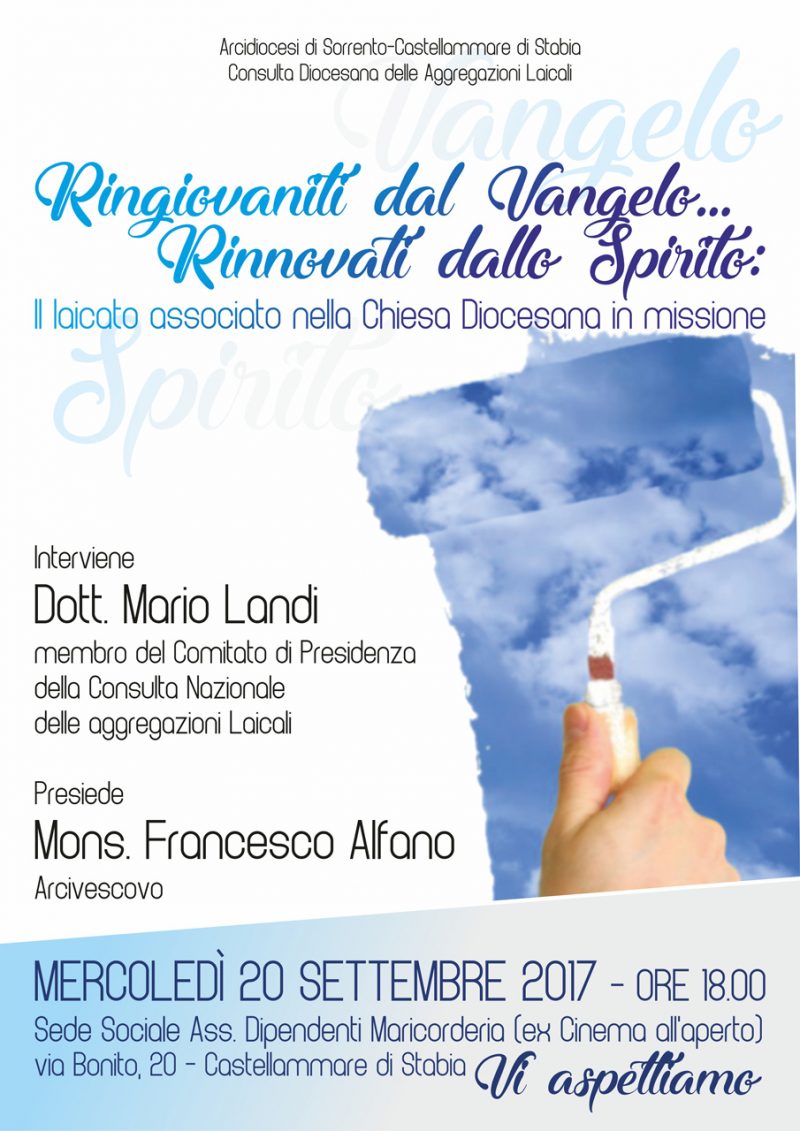 La Consulta Diocesana delle Aggregazioni Laicali invita a partecipare all’incontro, che si terrà a Castellammare di Stabia, Mercoledì 20 Settembre, alle ore 18, presso la Sede sociale dell’Ass. Dip. Maricorderia, Via bonito 20, dal titolo: