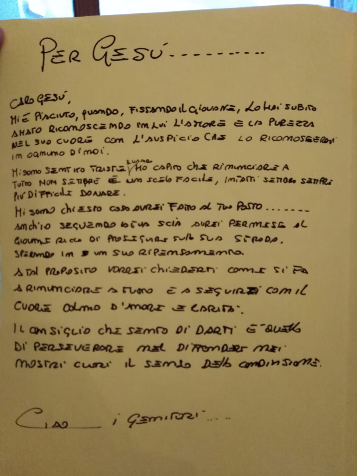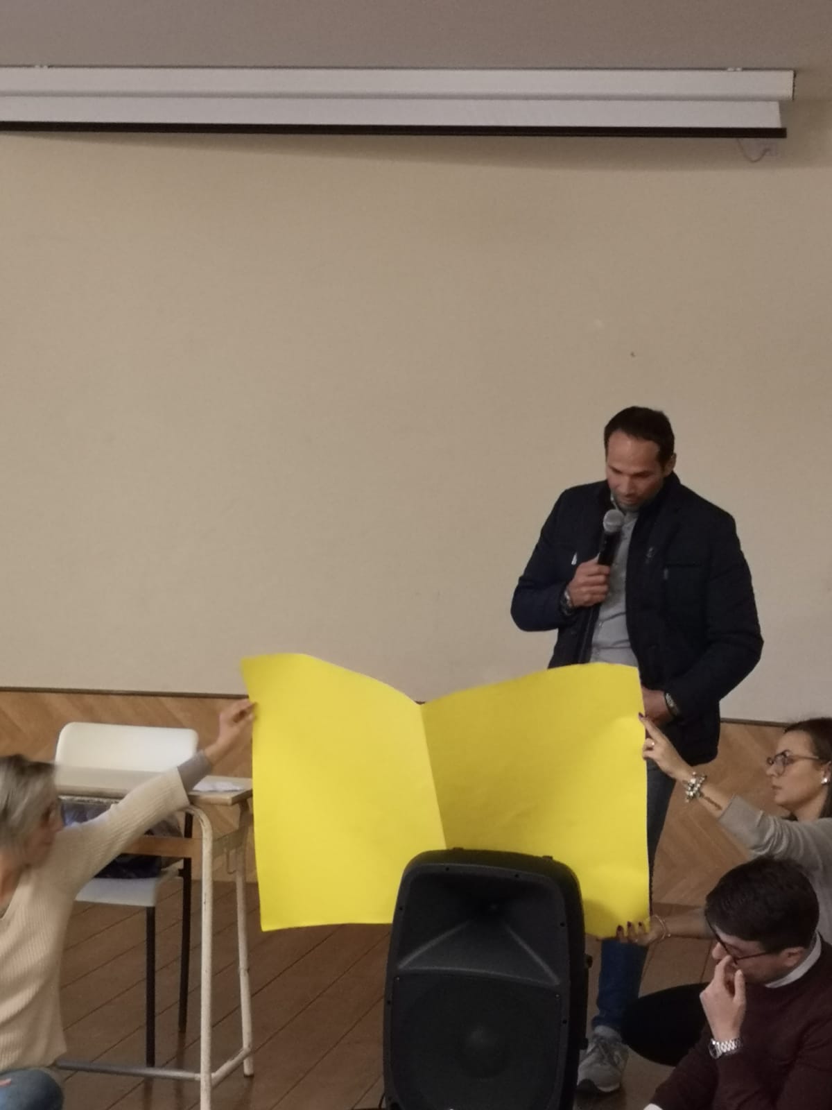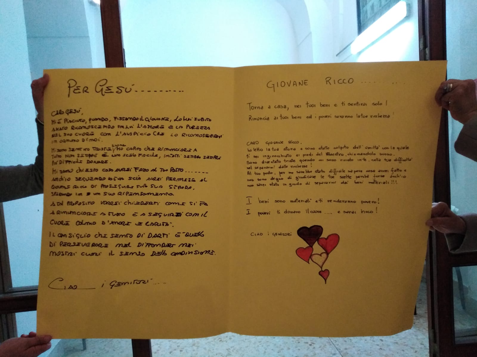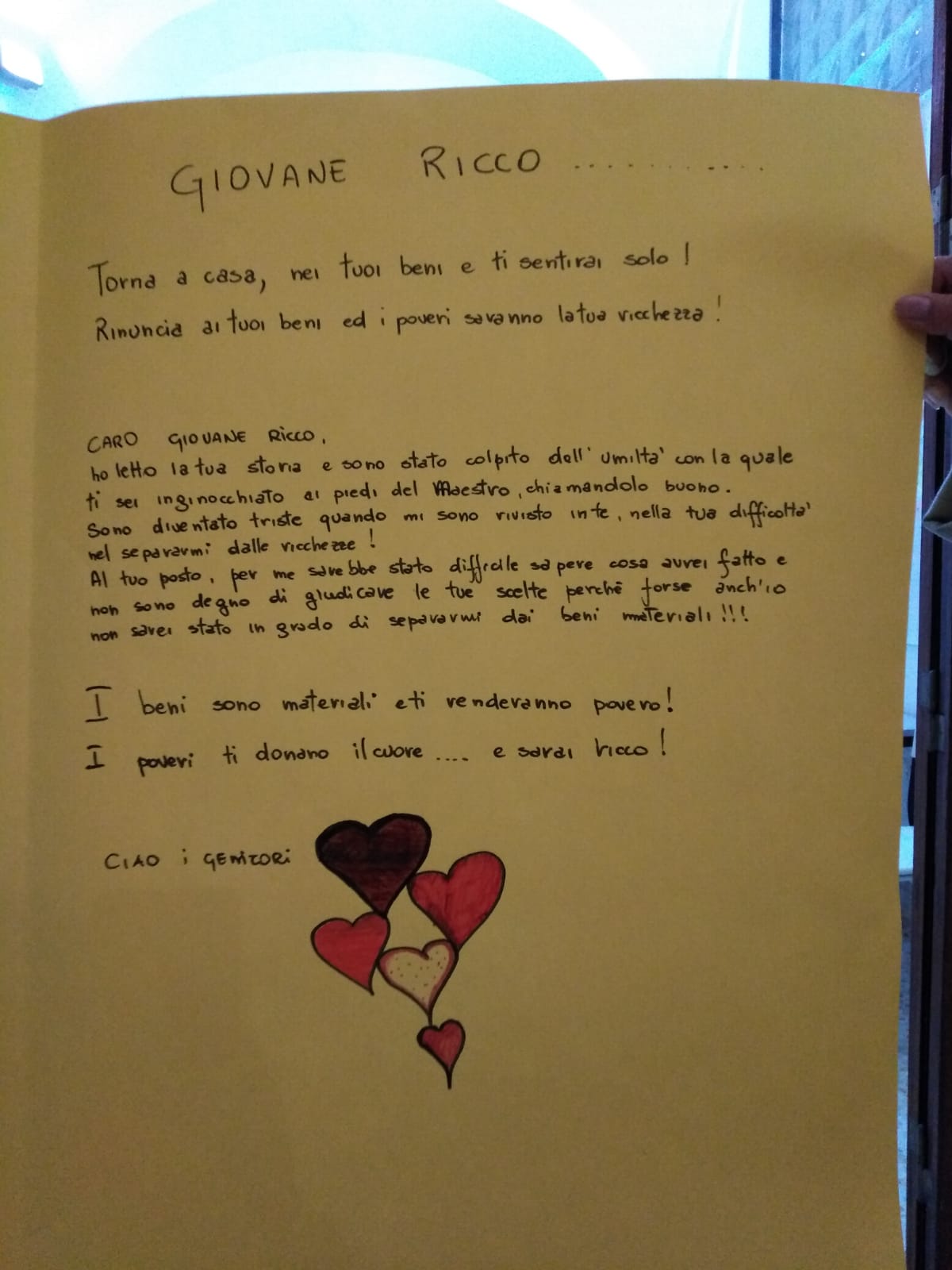 Ogni gruppo ha lavorato sul vangelo letto, dandone una propria interpretazione. Due gruppi hanno messo in scena un TG con genitori e bambini, mentre gli altri due gruppi hanno lavorato con emojon (i bambini associano ad ogni passo di vangelo un emojon) e due lettere composte dai genitori, una indirizzata al giovane ricco ed un altra a Gesù. A conclusione un piccolo commento del parroco sul vangelo e del nostro vice parroco sul brano della canzone di Ligabue “Una Vita da mediano” (genitori mediani dei figli, come nel calcio si recuperano i pallini persi dai difensori ma devono essere pronti a spianare loro la via ed il gioco per far sì che loro possano fare i goal più belli).