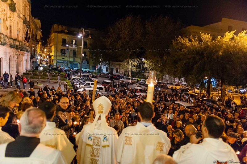 Al termine della celebrazione ogni membro del Consiglio pastorale diocesano, in rappresentanza dellintera comunità diocesana, ha acceso al cero pasquale una piccola luce che ha diffuso ai numerosi fedeli presenti che si sono avviati in processione verso luscita della Concattedrale. Sul sagrato, dopo aver pregato la Chiesa celeste, lArcivescovo ha impartito la benedizione allassemblea che si è sciolta sulle note della Salve Regina.