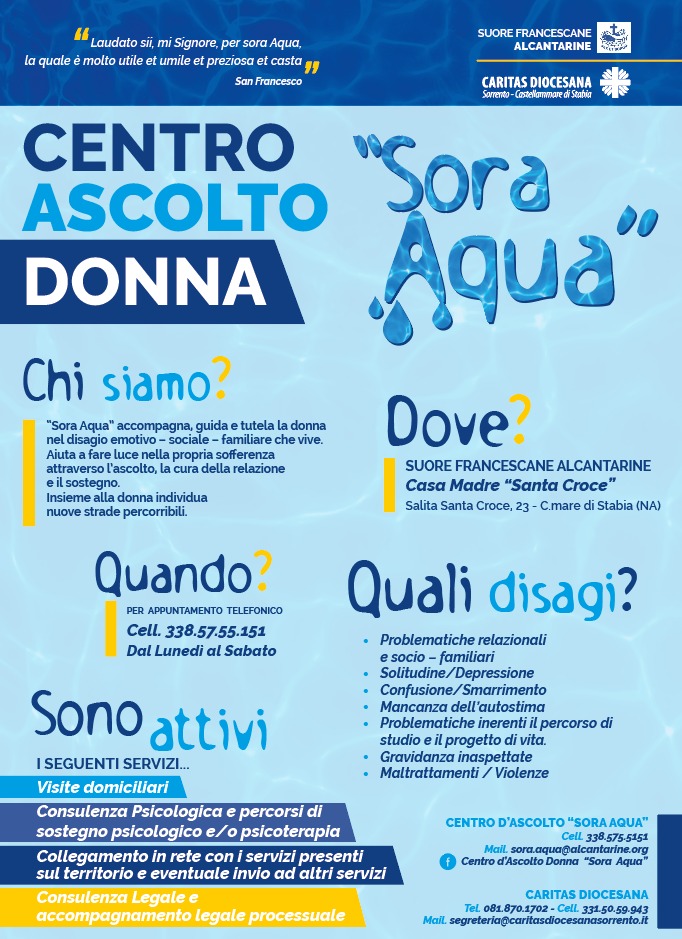 Il Centro d’ascolto “Sora Aqua”, promosso dalla Caritas diocesana in collaborazione con la fraternità delle Suore Francescane Alcantarine, è attivo dal 2002, sostenendo donne che vivono situazioni di difficoltà e disagi di ogni genere. Esse vengono accompagnate in un percorso graduale, ed aiutate a prendere consapevolezza delle proprie risorse in termini di rinascita.