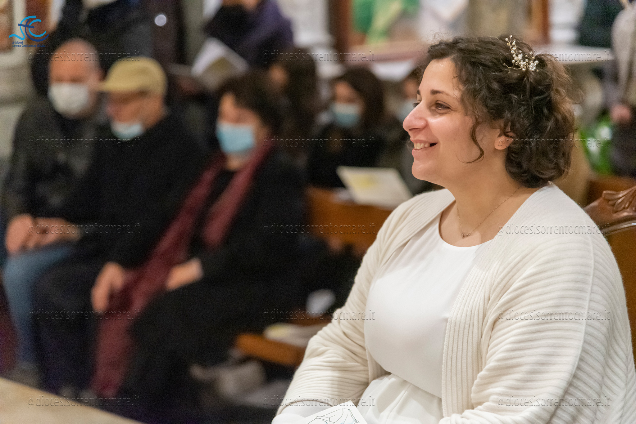 Antonietta Palummo, di anni 36, originaria di Lettere, ha espresso ieri sera il suo “Eccomi”, vestita di bianco, nella sua semplicità e con il suo sorriso. L’emozionante rito della consecratio virginum, il più antico della Chiesa, si è celebrato ieri sera sotto gli occhi dei presenti e di chi ha seguito la diretta in streaming. Mons. Alfano, prosegue la sua intensa omelia, dando del “tu” alla vergine sposa, la cui tensione quasi si poteva toccare con mano.
