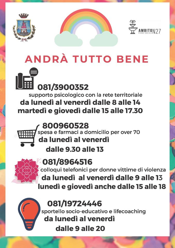 Il servizio fornirà assistenza telefonica a chiamando al numero 081 180 96 267, dal lunedì al sabato dalle ore 15:30 alle ore 17:30 e il venerdì dalle ore 09:30 alle ore 12:30, a chiunque sentirà la necessità di rivolgersi ad esperti come psicologi, assistenti sociali e legali per un trovare un punto di riferimento in questo contesto emergenziale da cui scaturiscono le le fragilità più profonde di disagio psicologico e sociale.