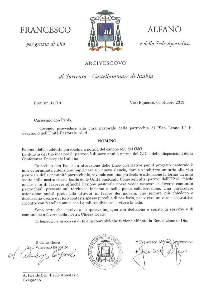 Don Leopoldo Lucarelli, in data 17 ottobre 2019, è stato nominato Vicario Parrocchiale delle parrocchie Sacri Cuori di Gesù e Maria in Messigno, Pompei e Santa Maria Goretti in Ponte Persica, Castellammare di Stabia.