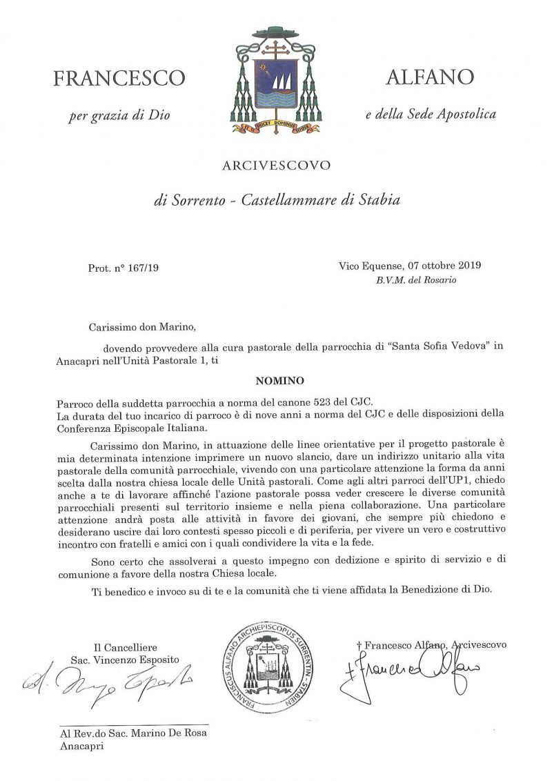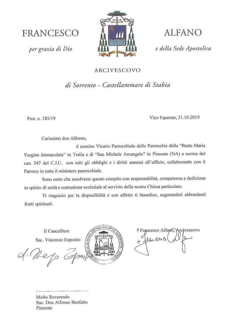 Don Alfonso Benfatto, in data 21 ottobre 2019, è stato nominato Vicario Parrocchiale delle parrocchie Beata Maria Vergine Immacolata e San Michele Arcangelo in Pimonte