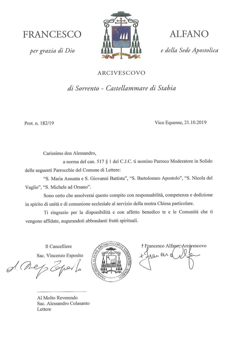 Don Alessandro Colasanto, in data 21 ottobre 2019, è stato nominato Parroco Moderatore in Solido delle parrocchie del Comune di Lettere. Santa Maria Assunta e San Giovanni Battista San Bartolomeo Apostolo San Nicola del Vaglio San Michele Arcangelo