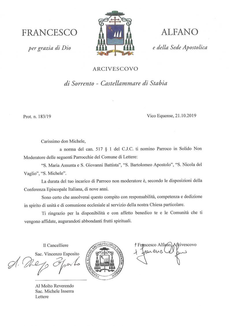 Don Michele Inserra, in data 21 ottobre 2019, è stato nominato Parroco in Solido non Moderatore delle parrocchie del Comune di Lettere. Santa Maria Assunta e San Giovanni Battista San Bartolomeo Apostolo San Nicola del Vaglio San Michele Arcangelo