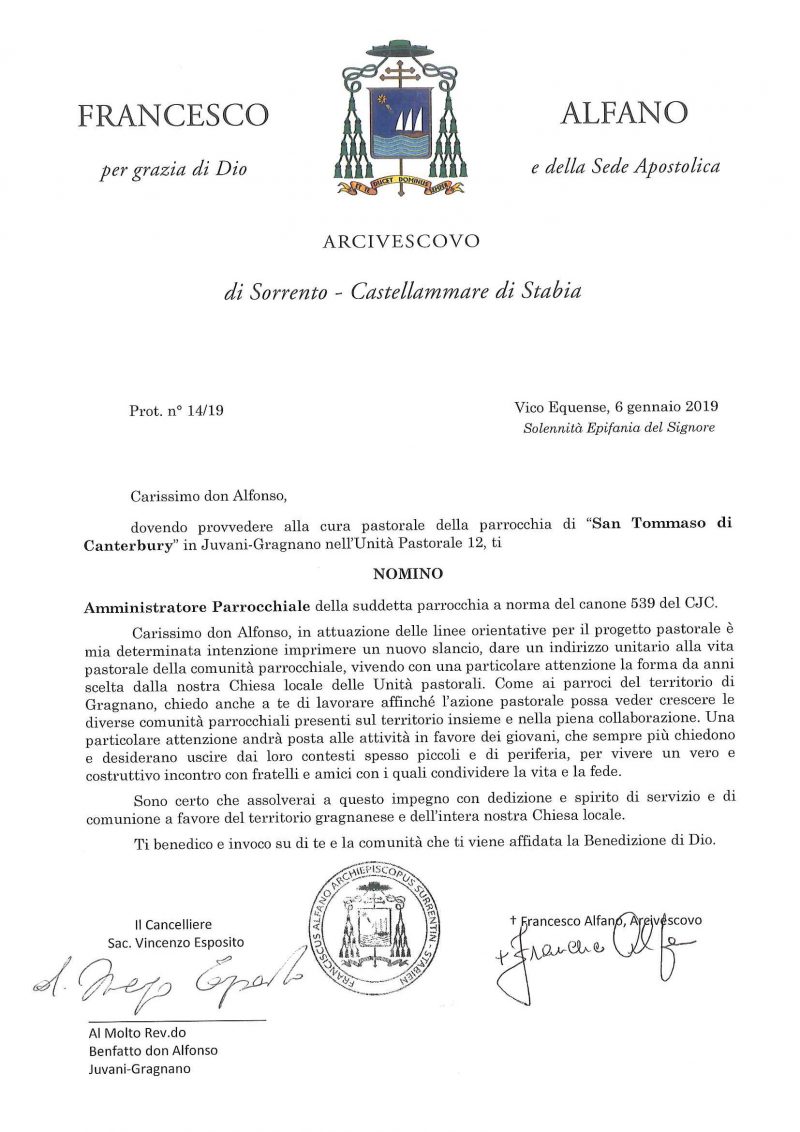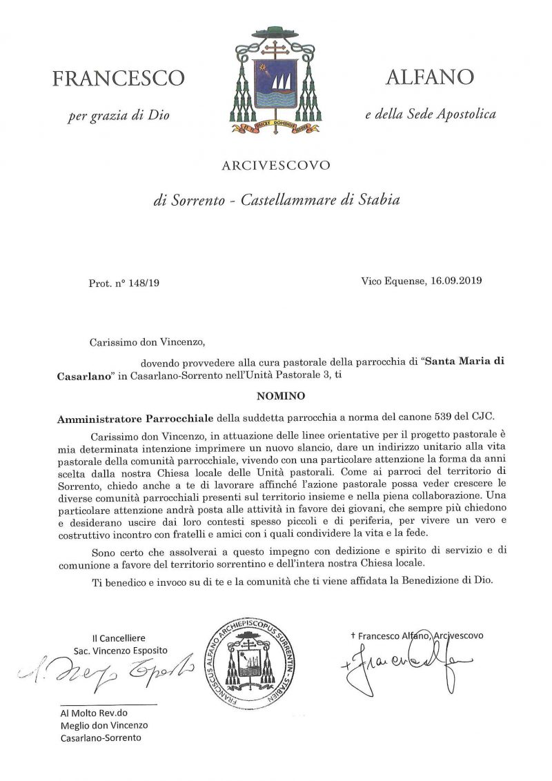 Don Vincenzo (Enzo) Meglio, in data 16 settembre 2019, è stato nominato Amministratore Parrocchiale della parrocchia Santa Maria di Casarlano a Casarlano in Sorrento. Don Vincenzo (Enzo), continuerà a svolgere il suo ministero pastorale anche presso la parrocchia Sant’Anna a Marina Grande in Sorrento.