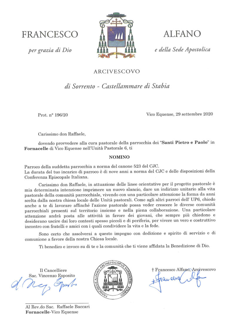 Don Antonio D’Urso, in data 05 febbraio 2020, è stato nominato Parroco delle parrocchie San Paolo Apostolo in Pastena e San Vito Martire in Acquara, ubicate nel comune di Massa Lubrense