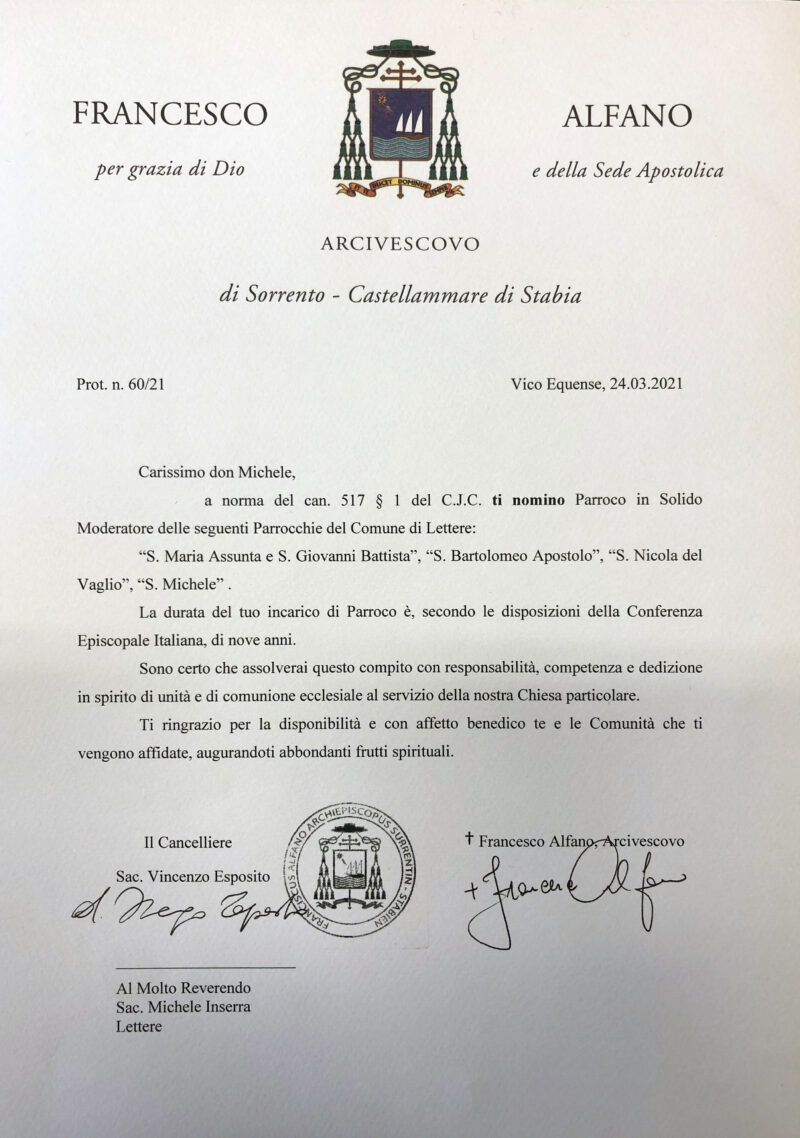 Don Michele Inserra, in data 24 marzo 2021, è stato nominato Parroco in Solido Moderatore delle parrocchie del Comune di Lettere. Santa Maria Assunta e San Giovanni Battista San Bartolomeo Apostolo San Nicola del Vaglio San Michele Arcangelo