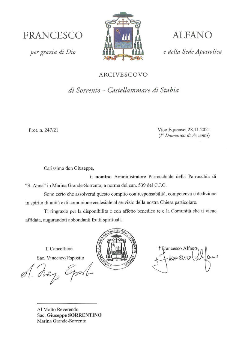 Don Mario Schisano, in data 12 aprile 2021, è stato nominato Amministratore Parrocchiale della parrocchia Santissima Addolorata in Marina di Puolo, Massa Lubrense.