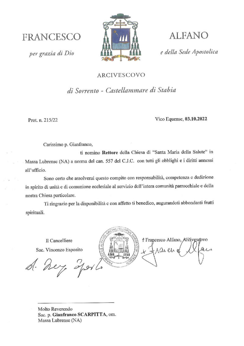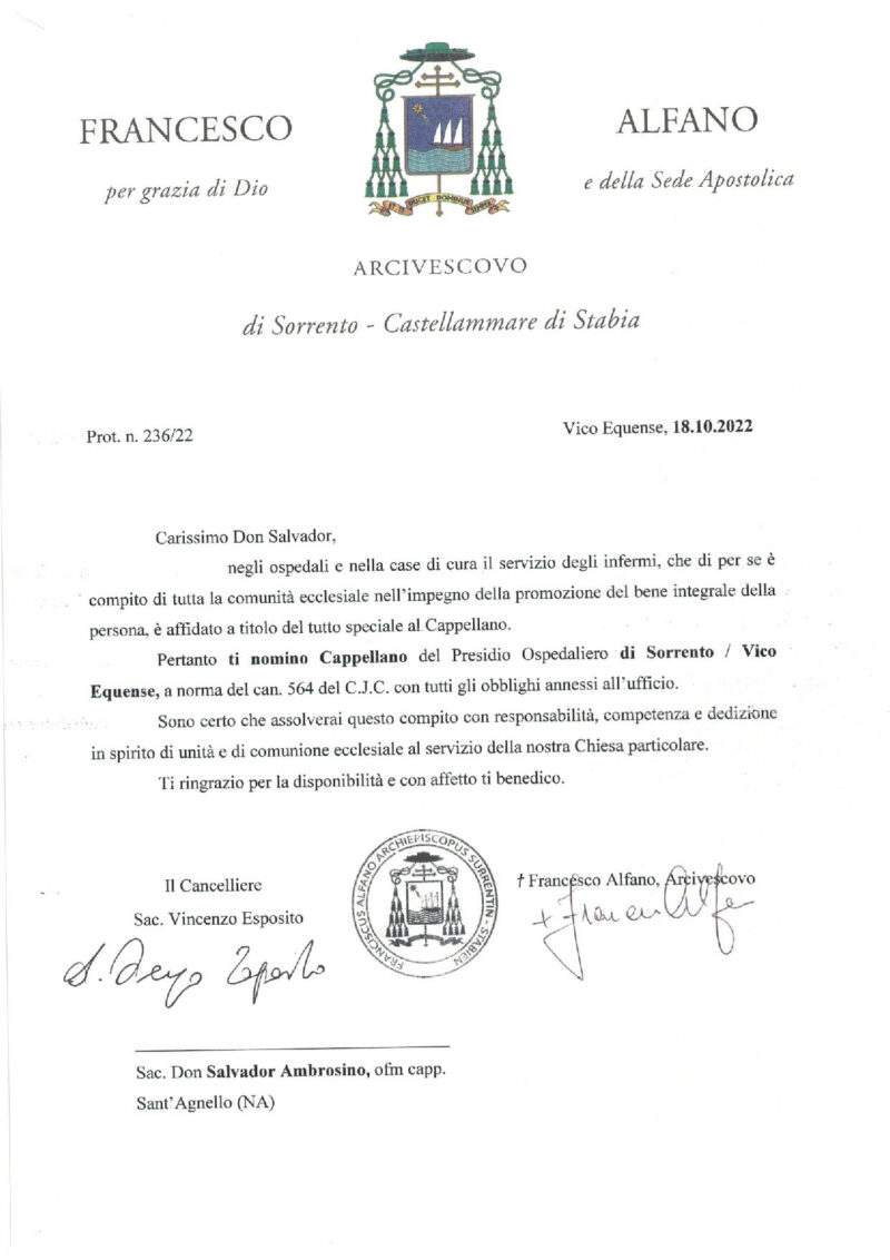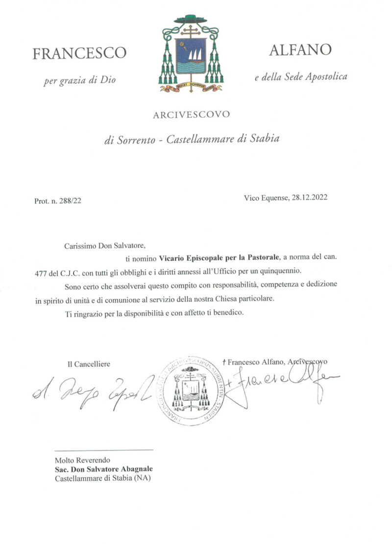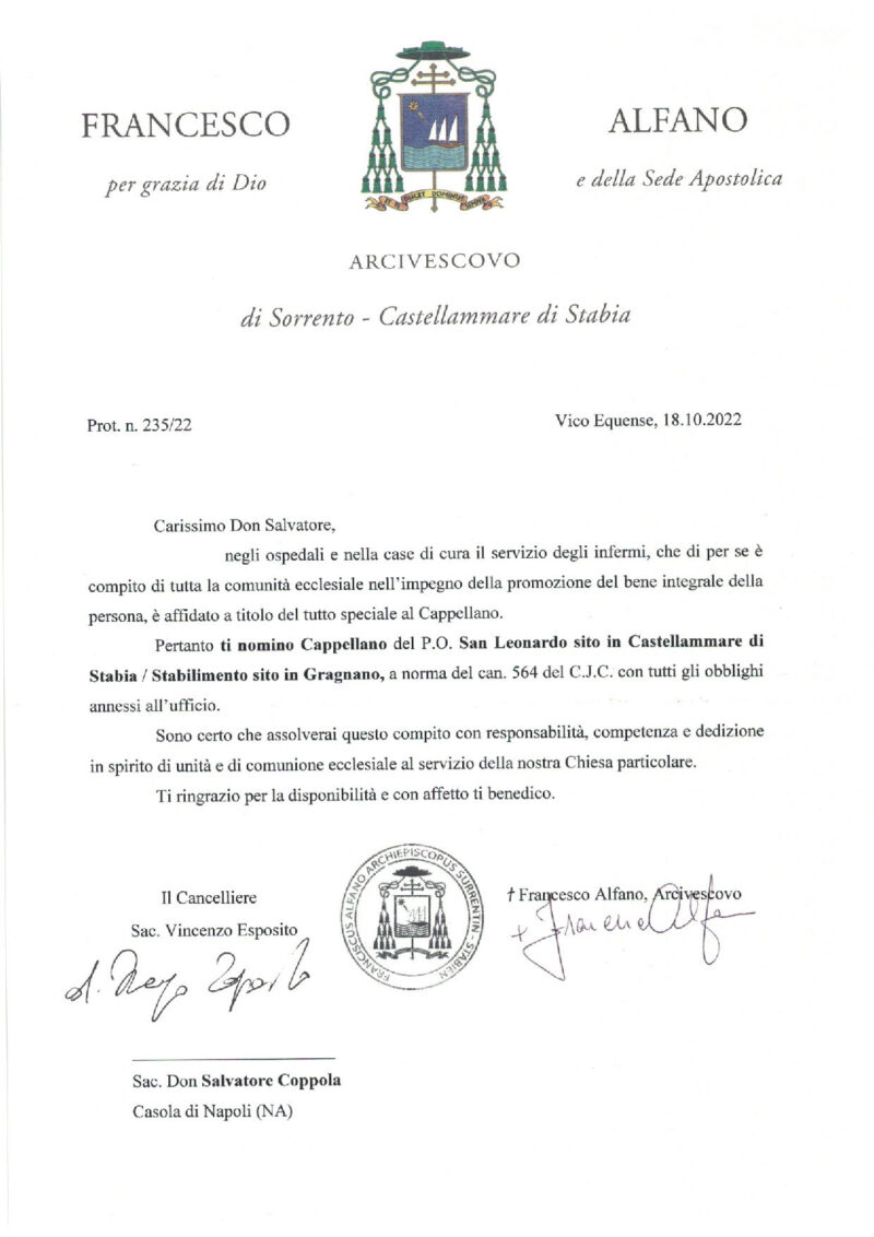 Don Salvatore Coppola, in data 18 ottobre 2022, è stato nominato Cappellano del P.O. San Leonardo sito in Castellammare di Stabia / Stabilimento sito in Gragnano.