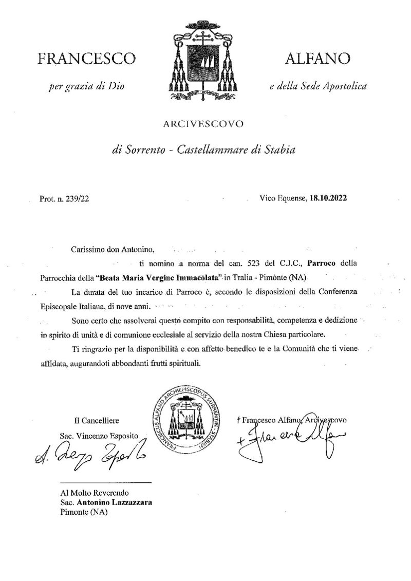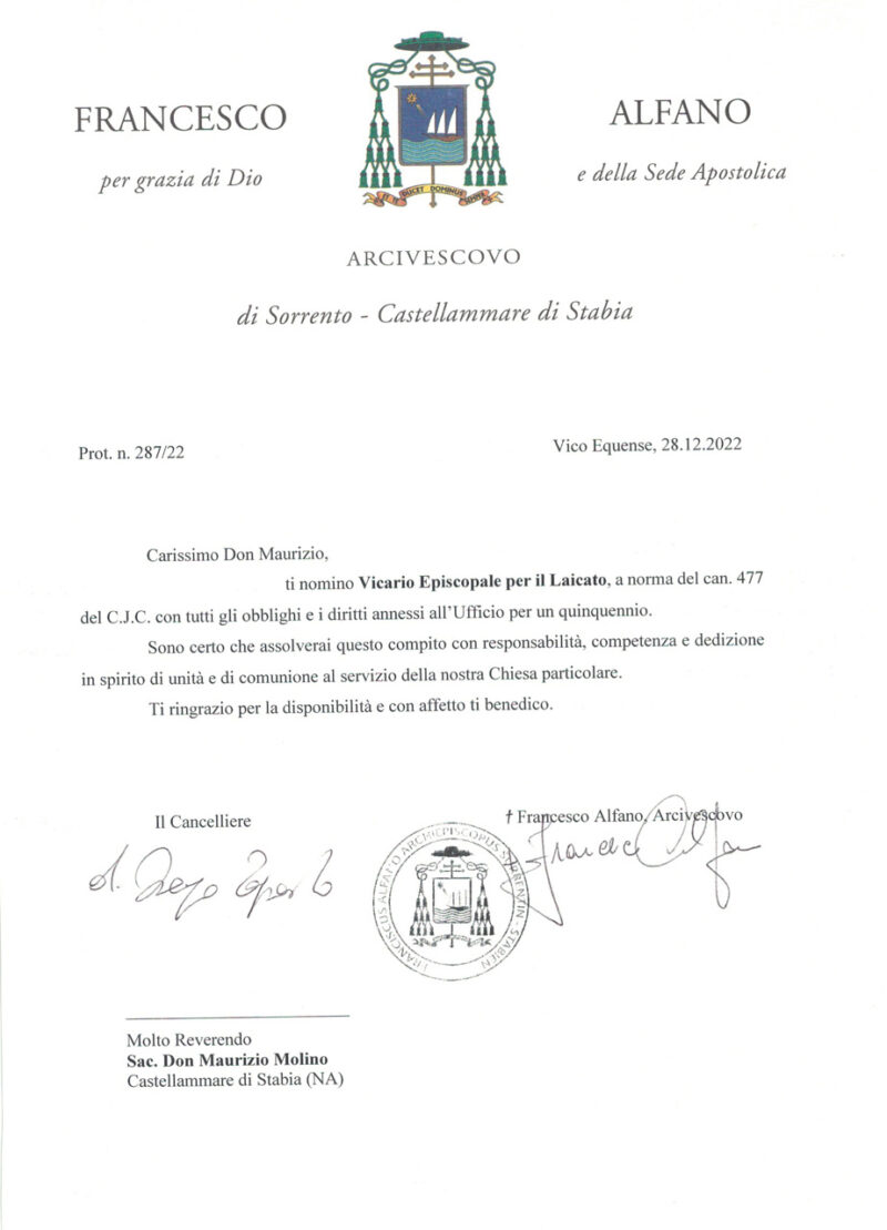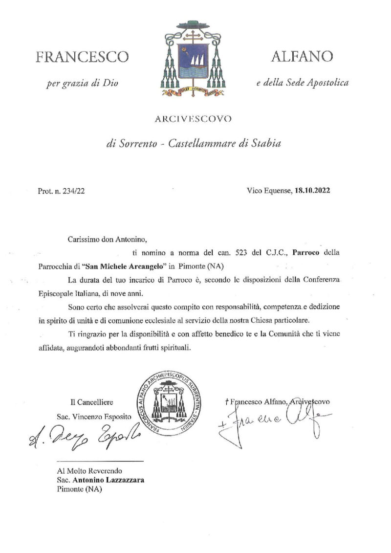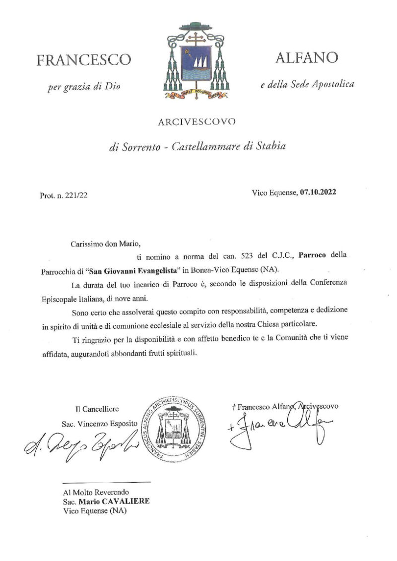 Don Salvatore Coppola, in data 18 ottobre 2022, è stato nominato Cappellano del P.O. San Leonardo sito in Castellammare di Stabia / Stabilimento sito in Gragnano.